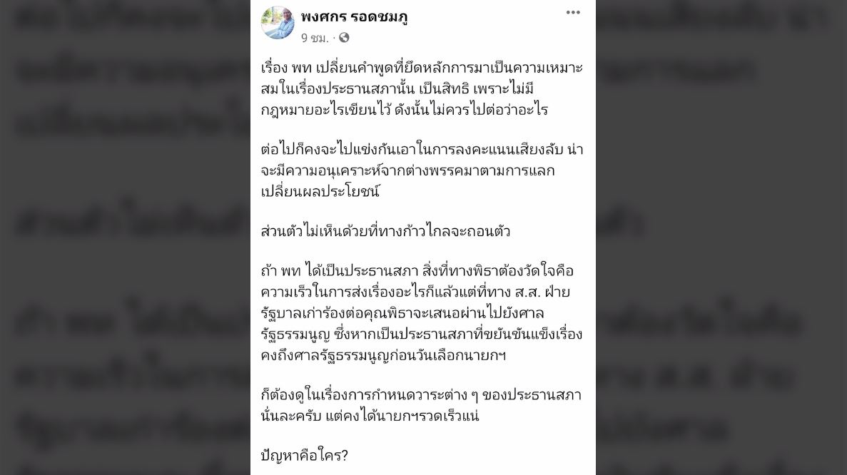 ขณะที่ พล.ท.พงศกร รอดชมภู อดีตรองหัวหน้าพรรคอนาคตใหม่ ชี้ว่า การเปลี่ยนท่าทีของพรรคเพื่อไทยเป็นสิทธิ เพราะไม่มีกฎหมายใดบัญญัติไว้ จึงไม่ควรไปต่อว่า หลังจากนี้คงต้องแข่งขันกันด้วยการลงคะแนนลับ และอาจเกิดการแลกเปลี่ยนผลประโยชน์กันระหว่างพรรคการเมือง และหากได้ประธานสภาฯ ที่มีความแข็งขันกับการตรวจสอบนายพิธา ลิ้มเจริญรัตน์ กระบวนการรวบรวมรายชื่อ ส.ส. เพื่อส่งศาลรัฐธรรมนูญวินิจฉัย อาจเกิดขึ้นก่อนวันโหวตเลือกนายกรัฐมนตรีก็เป็นได้. – สำนักข่าวไทย