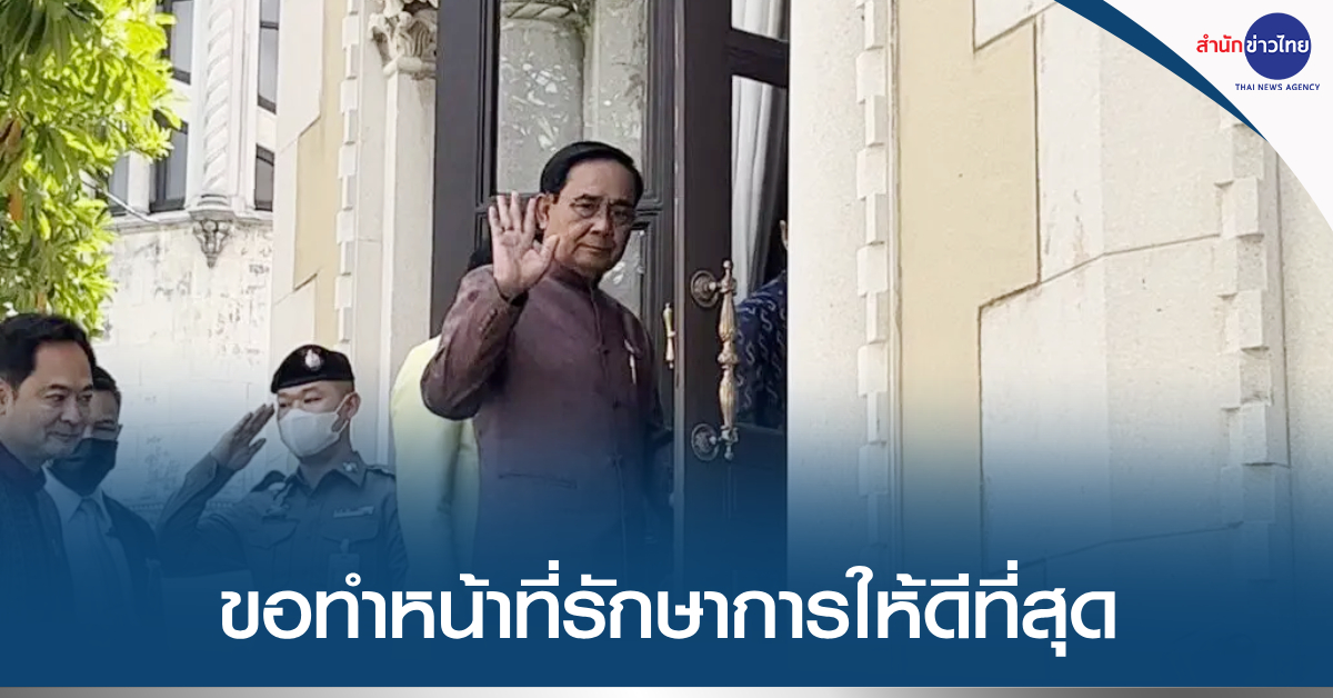 นายกรัฐมนตรี ปฏิเสธตอบคำถามว่า หากต้องรักษาการนายกรัฐมนตรียาวจะว่าอย่างไร พร้อมยกมือสวัสดี และโบกมือแทนคำตอบ ก่อนที่จะเดินเข้าไปยังตึกไทยคู่ฟ้า.-สำนักข่าวไทย