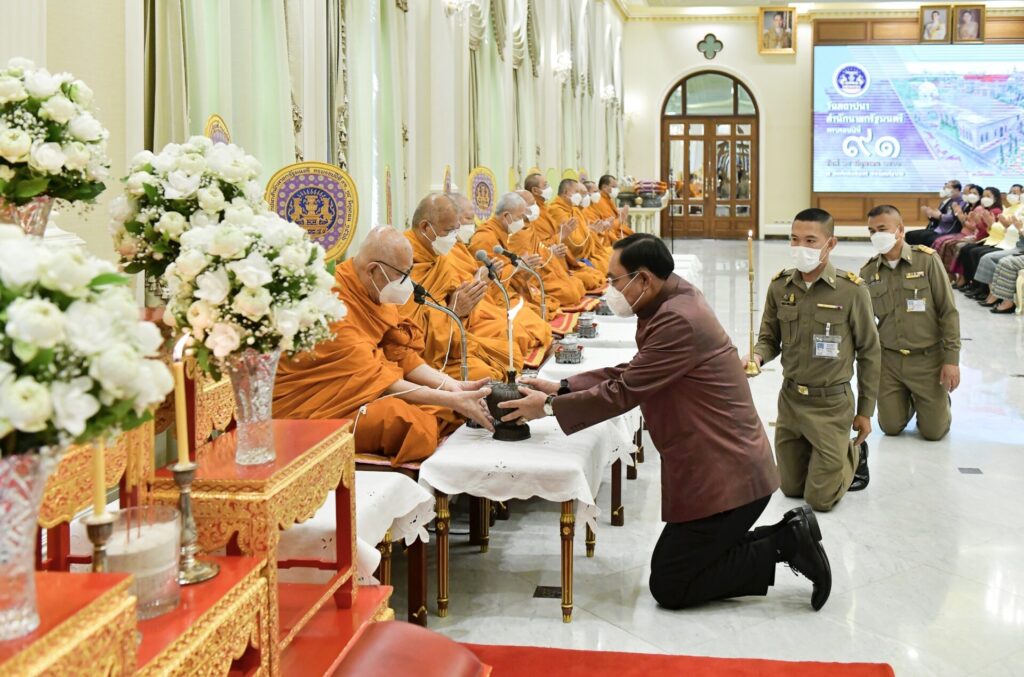 โอกาสนี้ นายกรัฐมนตรีจุดธูปเทียนบูชาพระรัตนตรัยและถวายตาลปัตรแด่พระสงฆ์ จำนวน 10 รูป เจ้าหน้าที่อาราธนาศีล พระสงฆ์ให้ศีล นายกรัฐมนตรีจุดเทียนน้ำมนต์ พระสงฆ์เจริญพระพุทธมนต์ จากนั้น นายกรัฐมนตรี รัฐมนตรี และตัวแทนผู้บริหารในสังกัดสำนักนายกรัฐมนตรี ถวายเครื่องไทยธรรมและปิ่นโต นายกรัฐมนตรีถวายผ้าไตร จำนวน 10 ไตร พระสงฆ์สวดอนุโมทนา นายกรัฐมนตรีกรวดน้ำ ต่อจากนั้น สมเด็จพระพุฒาจารย์ เจ้าอาวาสวัดไตรมิตรวิทยารามวรวิหาร ประธานสงฆ์ ประพรมน้ำพระพุทธมนต์แก่ผู้เข้าร่วมพิธีเพื่อความเป็นสิริมงคล เป็นอันเสร็จพิธี