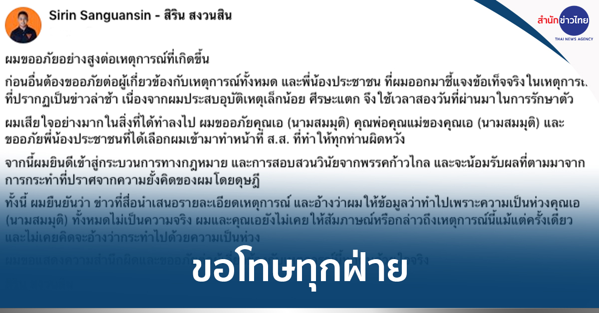 กรุงเทพฯ 29 มิ.ย.- “สิริน” โพสต์เฟซบุ๊ก ขอโทษทุกฝ่ายเหตุทำร้ายร่างกายแฟนสาว พร้อมเข้าสู่กระบวนการตามกฎหมายและทางวินัยของพรรคก้าวไกล เผยออกมาชี้แจงช้าเพราะประสบอุบัติเหตุ
