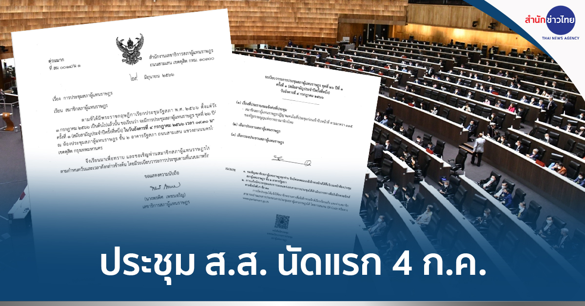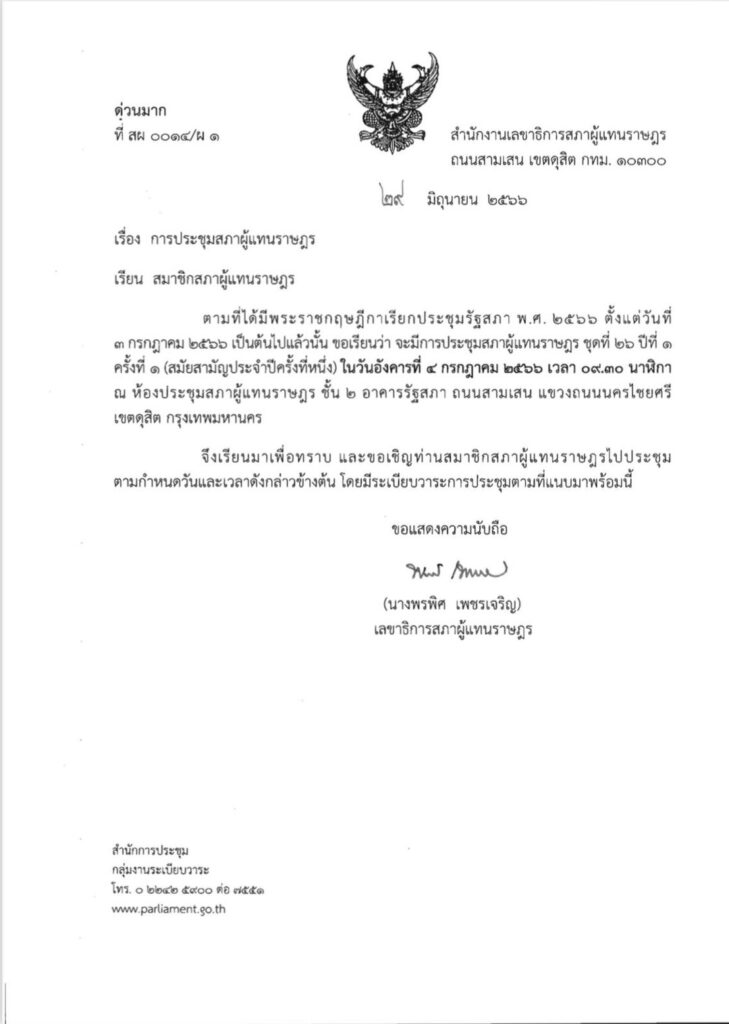 เลขาธิการสภาผู้แทนราษฎร มีหนังสือด่วนมาก ที่ สผ 0015/ผ1 ลงวันที่ 29 มิ.ย. แจ้งไปยังสมาชิกสภาผู้แทนราษฎรชุดที่ 26 เรื่อง การประชุมสภาผู้แทนราษฎร โดยระบุว่า ตามที่ได้มีพระราชกฤษฎีกาเรียกประชุมรัฐสภา พ.ศ. 2566 ตั้งแต่วันที่ 3 กรกฎาคม 2566 เป็นต้นไปแล้วนั้น ขอเรียนว่า จะมีการประชุมสภาผู้แทนราษฎร ชุดที่ 27 ปีที่ 1 ครั้งที่ 1 (สมัยสามัญประจำปีครั้งที่หนึ่ง) ในวันอังคารที่ 4 กรกฎาคม 2566 เวลา 09.30 น. ณ ห้องประชุมสภาผู้แทนราษฎร ชั้น 2 อาคารรัฐสภา ถนนสามเสน แขวงถนนนครไชยศรีเขตดุสิต กรุงเทพมหานคร จึงเรียนมาเพื่อทราบ และขอเชิญท่านสมาชิกสภาผู้แทนราษฎรไปประชุม ตามกำหนดวันและเวลาดังกล่าวข้างต้น โดยมีระเบียบวาระการประชุม ประกอบด้วย