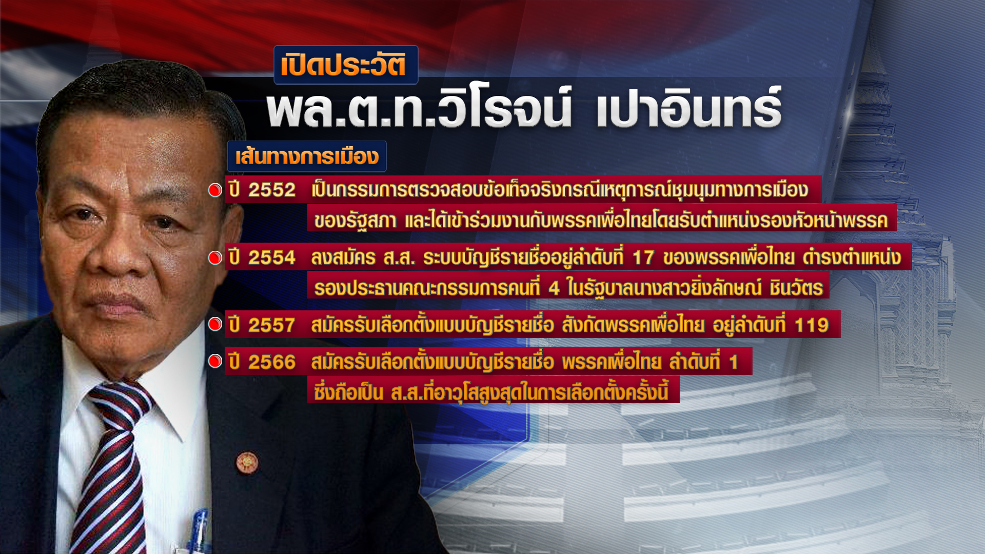 - ปี 2566 สมัครรับเลือกตั้ง ส.ส.แบบบัญชีรายชื่อ พรรคเพื่อไทย ลำดับที่ 1 ซึ่งถือเป็น ส.ส.ที่อาวุโสสูงสุดในการเลือกตั้งครั้งนี้