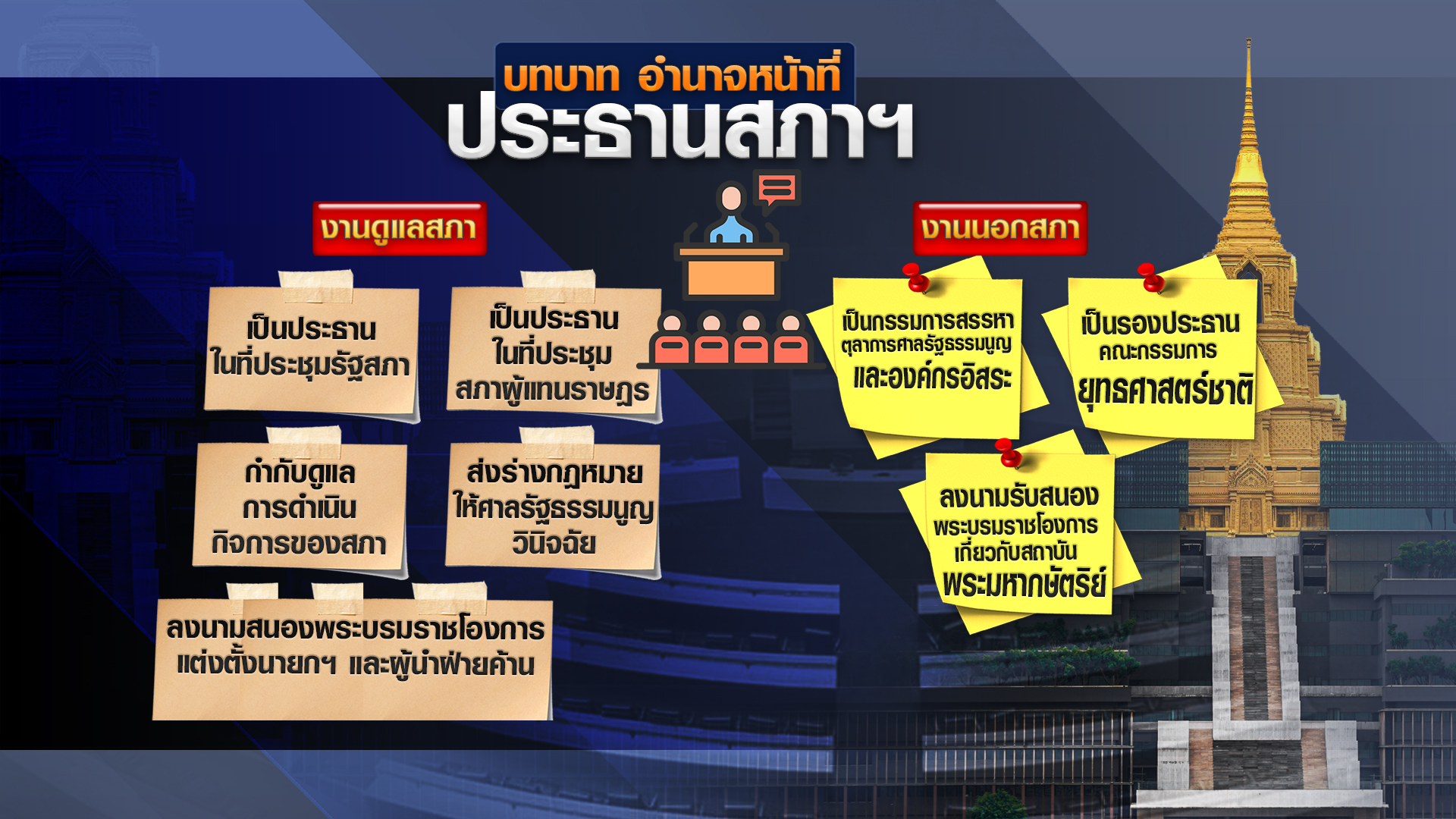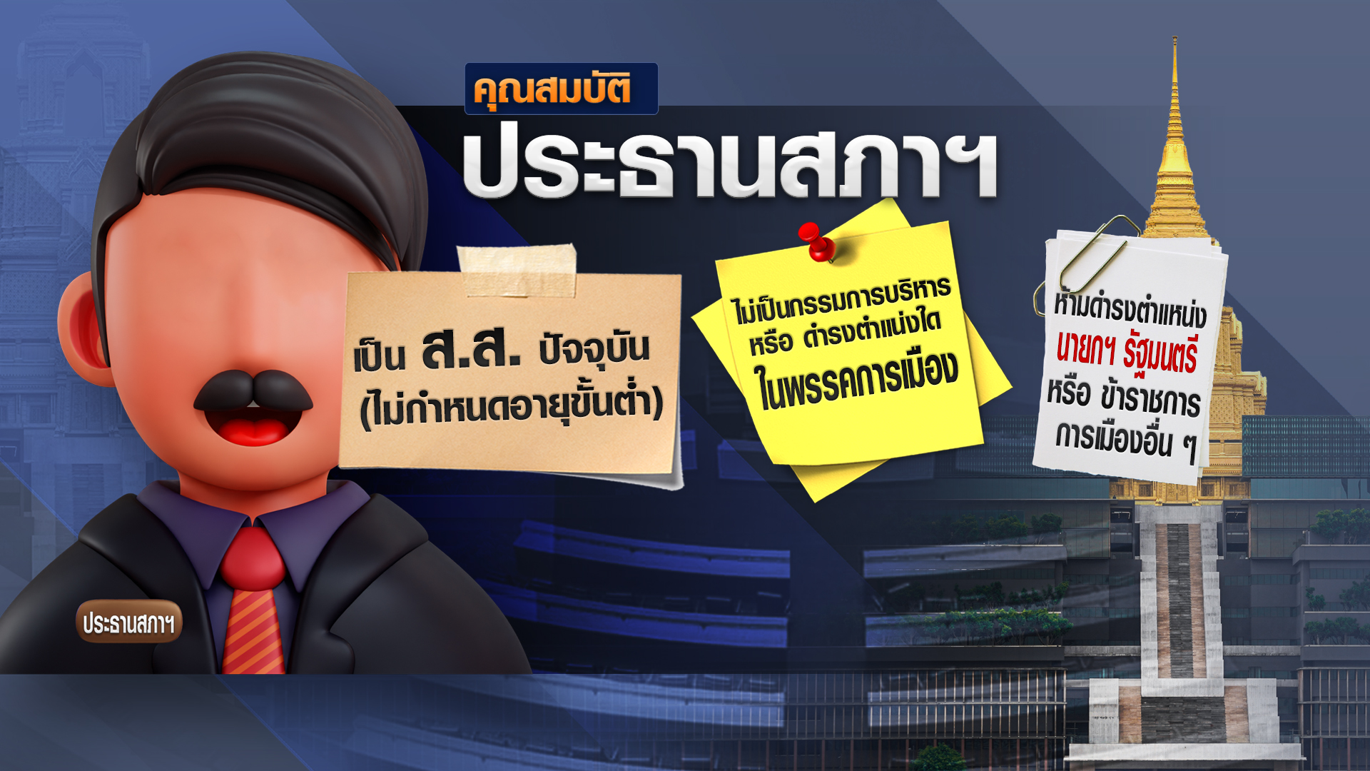 ส่วนคุณสมบัติของผู้ที่พร้อมจะปฏิบัติหน้าที่ประธานสภาฯ ตามกฎหมาย ต้องเป็น ส.ส.ปัจจุบัน (ไม่กำหนดอายุขั้นต่ำ) ไม่เป็นกรรมการบริหาร หรือดำรงตำแน่งใดในพรรคการเมือง และห้ามดำรงตำแหน่งนายกรัฐมนตรี หรือข้าราชการการเมืองอื่นๆ และมีบทบาทในการทำหน้าที่ ทั้งงานในสภาฯ นอกสภาฯ และการประชุมสภาผู้แทนราษฎร. – สำนักข่าวไทย