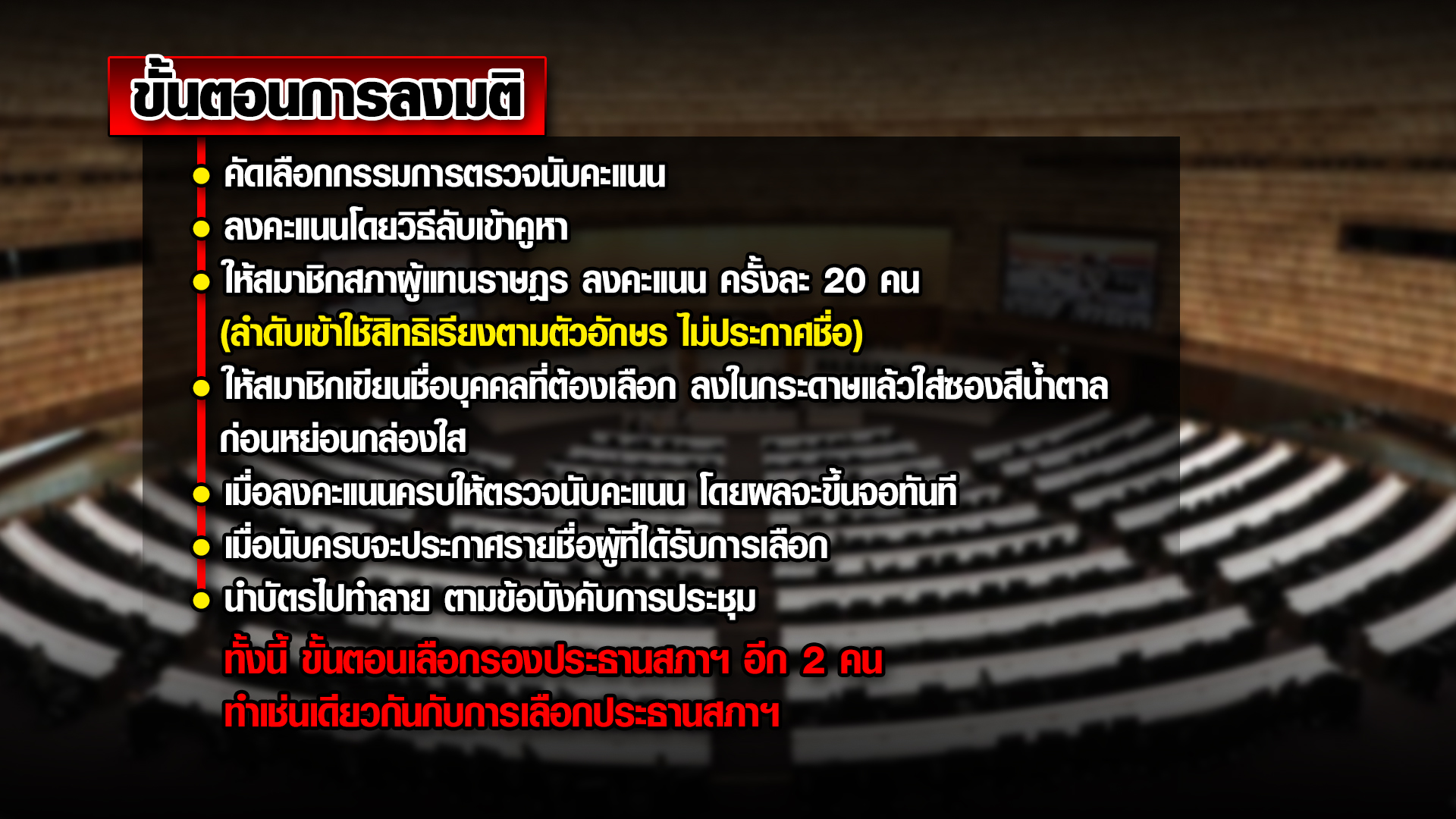 ส่วนขั้นตอนในการเลือกประธานสภาฯ ขั้นตอนแรกจะเปิดให้เสนอชื่อบุคคลที่จะเป็นประธานสภาฯ ต้องมีผู้รับรอง 20 คน ขั้นตอนที่ 2 ให้แสดงวิสัยทัศน์ และขั้นตอนที่ 3 เปิดให้ลงมติ ซึ่งกรณีมีการเสนอชื่อบุคคลคนเดียว ตัดขั้นตอนที่ 3 ทิ้ง คือไม่ต้องลงคะแนน โดยให้ถือว่าบุคคลนั้นได้เป็นประธานสภาฯ ส่วนกรณีมีหลายตัวเลือก นอกจากเปิดให้ลงมติ ยังต้องมีขั้นตอนการคัดเลือกกรรมการตรวจนับคะแนน ลงคะแนนโดยวิธีลับเข้าคูหา และให้ ส.ส.ลงคะแนนครั้งละ 20 คน โดยลำดับเข้าใช้สิทธิเรียงตามตัวอักษร และเมื่อลงคะแนนครบแล้ว ให้ตรวจนับคะแนน โดยผลจะขึ้นที่จอทันที จากนั้นเมื่อนับครบจะประกาศรายชื่อผู้ที่ได้รับเลือก ซึ่งขั้นตอนการเลือกรองประธานสภาฯ อีก 2 คน ก็จะทำในลักษณะเดียวกันกับการเลือกประธานสภาฯ