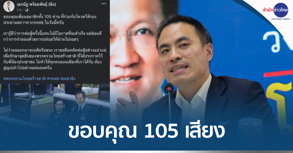 เมื่อวันที่ 4 ก.ค. นายเอกนัฏ พร้อมพันธุ์ ส.ส.บัญชีรายชื่อ เลขาธิการพรรครวมไทยสร้างชาติ (รทสช.) โพสต์เฟซบุ๊ก และทวีตข้อความระบุว่า “ ขอบคุณเพื่อนสมาชิกทั้ง 105 ท่าน ที่ร่วมกันโหวตให้รองประธานสภาฯ จาก รทสช. ในวันนี้ครับ เรารู้ดีว่าการต่อสู้ครั้งนี้แทบไม่มีโอกาสที่จะสำเร็จ แต่ย่อมดีกว่าการจำยอมด้วยการปล่อยให้ผ่านไปเฉยๆ ไม่ว่าผลออกมาจะแพ้หรือชนะ เราขอยืนหยัดต่อสู้อย่างแน่วแน่เพื่อรักษาจุดยืนของพรรครวมไทยสร้างชาติ ที่ได้ประกาศไว้กับพี่น้องประชาชน ไม่ทำให้ทุกคะแนนเสียงที่เราได้รับ ต้องสูญเปล่าไปอย่างแน่นอนครับ” .-สำนักข่าวไทย