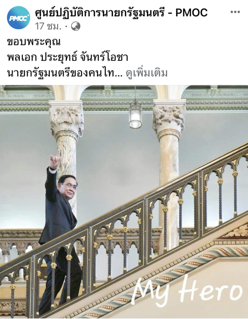 ทั้งนี้ภายหลังจากที่ พล.อ.ประยุทธ์ ประกาศวางมือทางการเมือง เพจเฟซบุ๊กศูนย์ปฏิบัติการนายกรัฐมนตรี หรือ PMOC ซึ่งเป็น เพจการทำงานด้านประชาสัมพันธ์ของนายกรัฐมนตรี ได้โพสต์ข้อความ “ขอบพระคุณ พล.อ.ประยุทธ์ จันทร์ โอชา นายกรัฐมนตรีของคนไทยทั้งประเทศ 11 ก.ค.2566” พร้อมโพสต์รูปภาพ พล.อ.ประยุทธ์ เดินขึ้นบันไดบนตึกไทยคู่ฟ้า ชูมือสัญญลักษณ์ไอเลิฟยู และระบุข้อความ “มายฮีโรบนภาพ” .-สำนักข่าวไทย