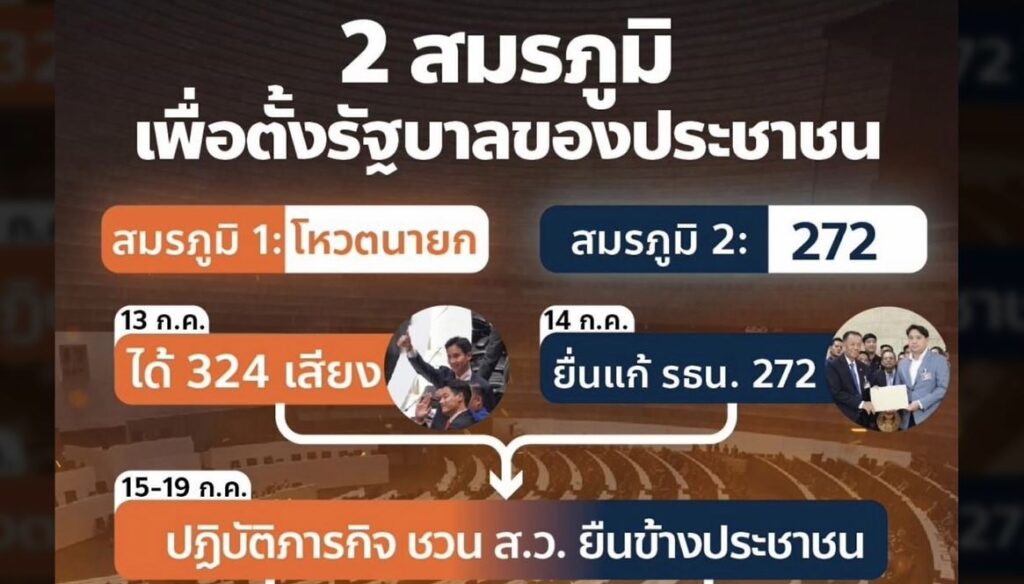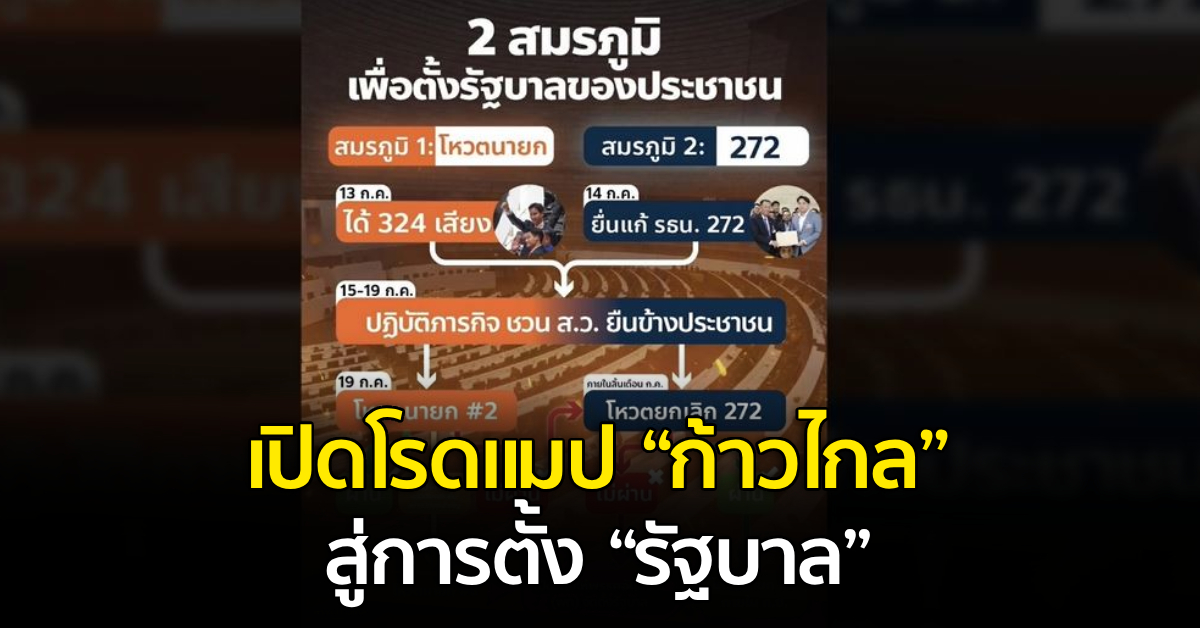 เฟซบุ๊กพรรคก้าวไกลโชว์โรดแมป “ก้าวไกล” แคมเปญใน 2 สมรภูมิเพื่อตั้งรัฐบาลของประชาชน โดยระบุว่าหลังจากการโหวตนายกรัฐมนตรีครั้งแรก เมื่อวันที่ 13 กรกฎาคม 2566 พิธา ลิ้มเจริญรัตน์ แคนดิเดตนายกรัฐมนตรีของพรรคก้าวไกล ได้รับคะแนน 324 เสียง จากสมาชิกรัฐสภา ยังไม่สามารถจัดตั้งรัฐบาลตามความคาดหวังของประชาชน พรรคก้าวไกลถือว่าภารกิจนี้ยังไม่จบ เราจะพยายามอย่างถึงที่สุดเพื่อจัดตั้งรัฐบาลให้ได้ โดยจะมีการขับเคลื่อนใน 2 สมรภูมิ ดังนี้
