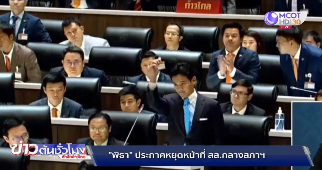 นายพิธา ลิ้มเจริญรัตน์ แคนดิเดตนายกรัฐมนตรีจากพรรคก้าวไกล ลุกขึ้นกล่าวกับที่ประชุมรัฐสภาว่า “ศาลรัฐธรรมนูญมีคำสั่งให้ผมหยุดปฏิบัติหน้าที่ เพราะฉะนั้นขอพูดกับท่านประธานว่า รับทราบคำสั่ง และจะปฏิบัติตามอย่างที่เป็นคำสั่ง จนกว่าจะมีคำวินิจฉัยเป็นอื่น ขอใช้โอกาสนี้ในการอำลาท่านประธานจนกว่าเราจะพบกันใหม่ และขอฝากเพื่อนสมาชิกรัฐสภาในการดูแลพี่น้องประชาชน ผมคิดว่าประเทศไทยเปลี่ยนไปไม่เหมือนเดิมอีกแล้ว ตั้งแต่วันที่ 14 พฤษภาคม ถ้าเกิดประชาชนชนะมาได้แล้วครึ่งทาง เหลืออีกครึ่งทาง ถึงแม้ว่าผมยังไม่ได้ปฏิบัติหน้าที่ แต่ขอให้เพื่อนสมาชิกทุกคนช่วยกันดูแลประชาชนต่อไป”