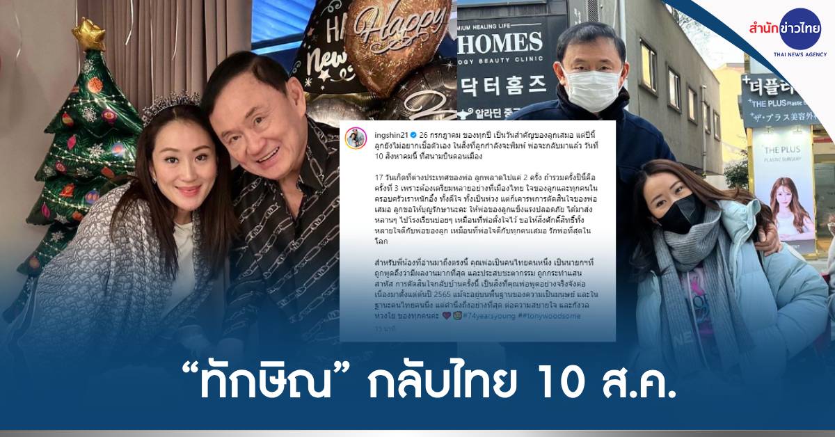 น.ส.แพทองธาร ชินวัตร แคนดิเดตนายกรัฐมนตรีพรรคเพื่อไทย โพสต์ข้อความผ่านเฟซบุ๊ก เปิดเผยกำหนดการการกลับบ้านของนายทักษิณ ชินวัตร บิดา โดยระบุว่า “26 ก.ค.ของทุกปี เป็นวันสำคัญของลูกเสมอ แต่ปีนี้ลูกยังไม่อยากเชื่อตัวเองในสิ่งที่ลูกกำลังจะพิมพ์ พ่อจะกลับมาแล้ว วันที่ 10 ส.ค.นี้ ที่สนามบินดอนเมือง 17 วันเกิดที่ต่างประเทศของพ่อ ลูกพลาดไปแค่ 2 ครั้ง ถ้ารวมครั้งปีนี้คือครั้งที่ 3 เพราะต้องเตรียมหลายอย่างที่เมืองไทย ใจของลูกและทุกคนในครอบครัวเราหนักอึ้ง ทั้งดีใจ ทั้งเป็นห่วง แต่ก็เคารพการตัดสินใจของพ่อเสมอ ลูกขอให้บุญรักษานะคะ ให้พ่อของลูกแข็งแรงปลอดภัย ได้มาส่งหลาน ๆ ไปโรงเรียนบ่อย ๆ เหมือนที่พ่อตั้งใจไว้ ขอให้สิ่งศักดิ์สิทธิ์ทั้งหลายใจดีกับพ่อของลูก เหมือนที่พ่อใจดีกับทุกคนเสมอ รักพ่อที่สุดในโลก”