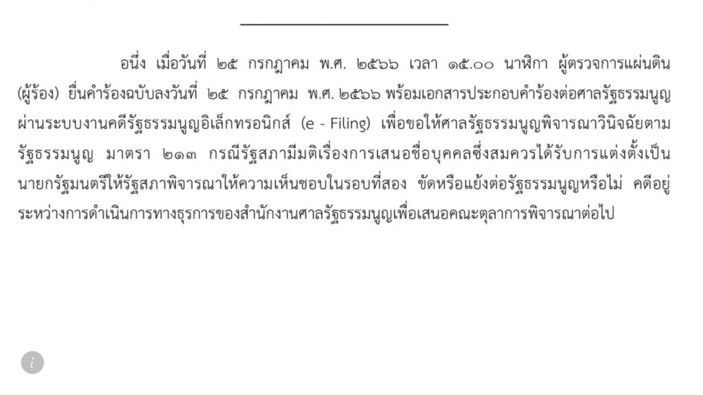 ผู้สื่อข่าวรายงานว่าตั้งแต่เช้า ที่สำนักงานศาลรัฐธรรมนูญมีผู้สื่อข่าว ไปติดตามการประชุมตุลาการศาลรัฐธรรมนูญ จำนวนหนึ่ง และในเวลาใกล้เที่ยง ศาลรัฐธรรมนูญได้เผยแพร่ข่าวในกรณีที่ผู้ตรวจการแผ่นดิน(ผู้ร้อง) ยื่นคำร้องฉบับลงวันที่ 25 กรกฎาคม พ.ศ. 2566 พร้อมเอกสารประกอบคำร้องต่อศาลรัฐธรรมนูญผ่านระบบงานคดีรัฐธรรมนูญอิเล็กทรอนิกส์ (e – Filing) เพื่อขอให้ศาลรัฐธรรมนูญพิจารณาวินิจฉัยตามรัฐธรรมนูญ มาตรา 213 กรณีรัฐสภามีมติเรื่องการเสนอชื่อบุคคลซึ่งสมควรได้รับการแต่งตั้งเป็นนายกรัฐมนตรีให้รัฐสภาพิจารณาให้ความเห็นชอบในรอบที่สอง ขัดหรือแย้งต่อรัฐธรรมนูญหรือไม่ คดีอยู่ระหว่างการดำเนินการทางธุรการของสำนักงานศาลรัฐธรรมนูญ เพื่อเสนอคณะตุลาการพิจารณาต่อไป โดยหลังจากการดำเนินการทางธุรการเสร็จสิ้น ก็จะส่งให้คณะตุลาการพิจารณาภายใน 5 วัน