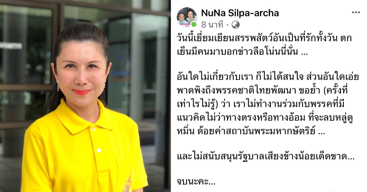 เมื่อวันที่ 26 ก.ค.66 น.ส. กัญจนา ศิลปอาชา ประธานที่ปรึกษาหัวหน้าพรรคชาติไทยพัฒนา โพสต์เฟซบุ๊กส่วนตัว ระบุว่า “วันนี้เยี่ยมเยียนสรรพสัตว์อันเป็นที่รักทั้งวัน ตกเย็นมีคนมาบอกข่าวลือโน่นนี่นั่น…อันใดไม่เกี่ยวกับเรา ก็ไม่ได้สนใจ ส่วนอันใดเอ่ยพาดพิงถึงพรรคชาติไทยพัฒนา ขอยํ้า (ครั้งที่เท่าไรไม่รู้) ว่า เราไม่ทำงานร่วมกับพรรคที่มีแนวคิดไม่ว่าทางตรงหรือทางอ้อม ที่จะลบหลู่ดูหมิ่น ด้อยค่าสถาบันพระมหากษัตริย์ … และไม่สนับสนุนรัฐบาลเสียงข้างน้อยเด็ดขาด…จบนะคะ… -สำนักข่าวไทย