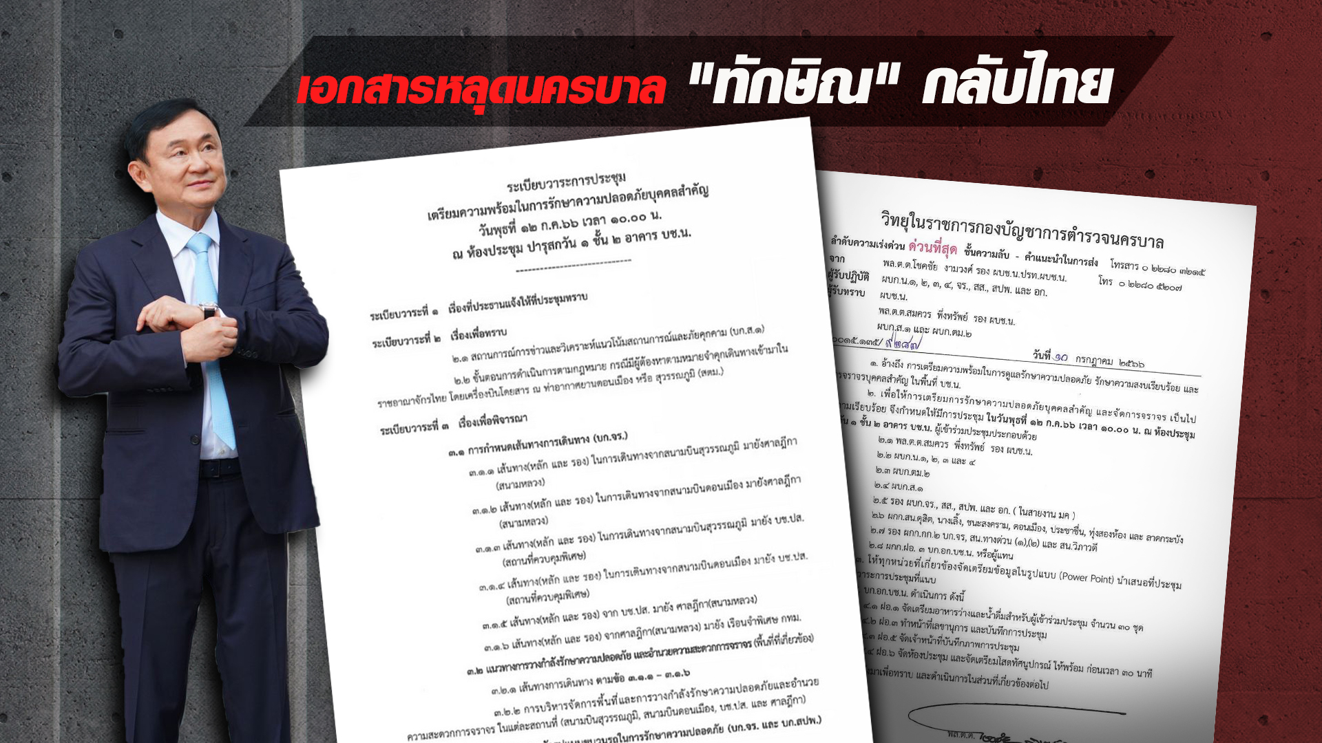 หลังจากนายทักษิณไปอยู่ต่างประเทศ ได้พยายามเคลื่อนไหวผ่านโซเชียล โดยเฉพาะในระยะหลัง นอกจากพูดเรื่องการเมือง ยังพูดบ่อยมากว่าจะกลับไทย โดยมีการระบุวันแน่ชัดว่าจะเป็นวันเกิด ก็คือวันนี้ (26 ก.ค.66) ทำให้เมื่อวันที่ 12 กรกฎาคม 2566 ถึงขั้นมีเอกสารหลุด กองบัญชาการตำรวจนครบาล 2 ประชุมเตรียมความพร้อมรักษาความปลอดภัยบุคคลสำคัญ โดยระเบียบวาระที่น่าสนใจ คือ ระเบียบวาระที่ 2.2 ขั้นตอนการดำเนินการตามกฎหมาย กรณีมีผู้ต้องหาตามหมายจำคุกเดินทางเข้ามาในราชอาณาจักรไทย โดยเครื่องบินโดยสาร ณ ท่าอากาศยานดอนเมือง หรือสุวรรณภูมิ