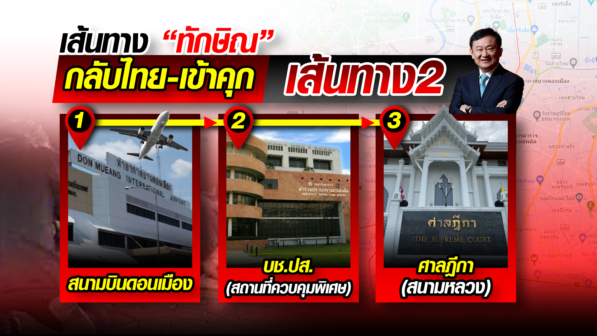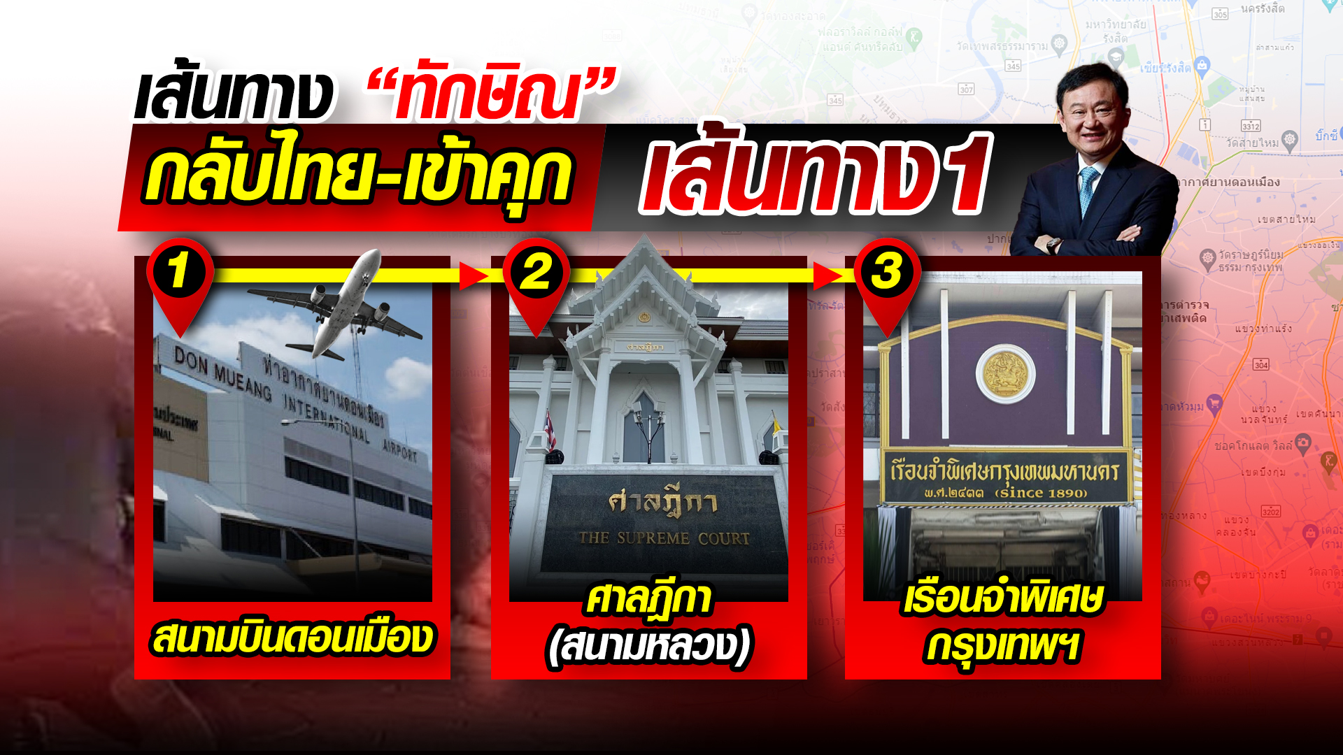 เส้นทางแรก คือ จากสนามบินดอนเมือง จะมีเจ้าหน้าที่มารอรับ และพาไปศาลฎีกาฯ ก่อนส่งตัวเข้าเรือนจำพิเศษกรุงเทพฯ