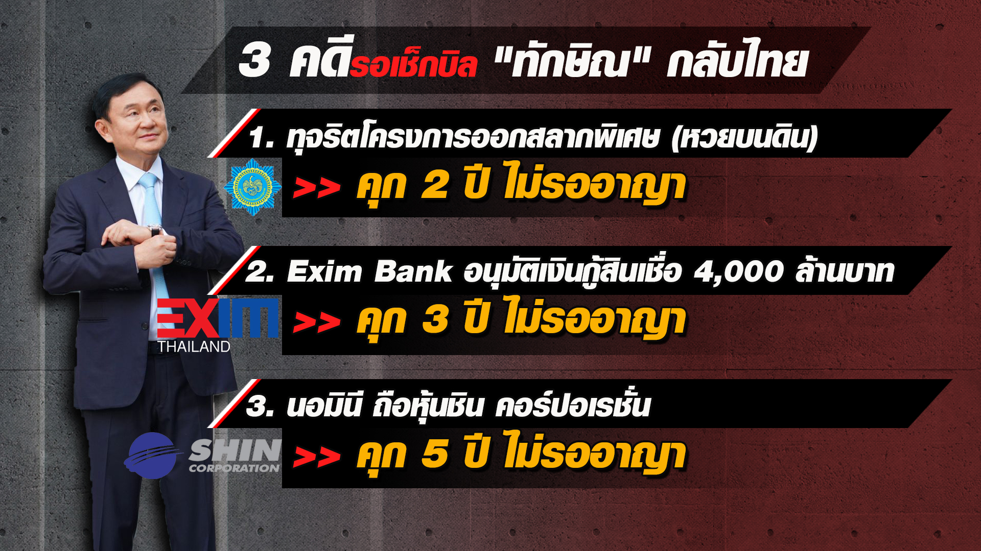 ส่วนที่เหลืออีก 3 คดี คดีแรก คดีหวยบนดิน หรือคดีทุจริตโครงการออกสลากพิเศษแบบเลขท้าย 3 ตัว 2 ตัว ของสำนักงานสลากกินแบ่งรัฐบาล ศาลฎีกาฯ พิพากษาจำคุกนายทักษิณ 2 ปี ไม่รอลงอาญา ตามประมวลกฎหมายอาญา มาตรา 157 คดีที่ 2 คดีธนาคารเพื่อการส่งออกและนำเข้าแห่งประเทศไทย (Exim Bank) อนุมัติเงินกู้สินเชื่อ 4,000 ล้านบาท โทษจำคุก 3 ปี ไม่รอลงอาญา และคดีที่ 3 คดีให้บุคคลอื่น (นอมินี) ถือหุ้นบริษัท ชิน คอร์ปอเรชั่น จำกัด (มหาชน) แทน ศาลฎีกาฯ พิพากษาจำคุก 5 ปี ไม่รอลงอาญา