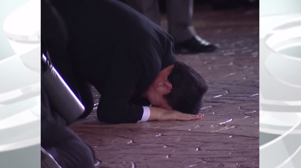 ส่วนนายทักษิณ ใช้เวลาพูดคุยกับครอบครัวในห้องวีไอพี ประมาณ 10 นาที ก่อนออกมาจากห้องรับรอง ทักทายคนที่มารอต้อนรับ ก่อนก้มกราบแผ่นดิน เรียกน้ำตาจากคนที่รักและศรัทธา จากนั้นได้เข้ามอบตัวที่ศาลฎีกาแผนกคดีอาญาของผู้ดำรงตำแหน่งทางการเมือง ตามหมายจับในคดีทุจริตที่ดินรัชดาฯ รวมถึงไปมอบตัวคดีปกปิดโครงสร้างผู้ถือหุ้นบริษัท เอสซี แอสเสทฯ ที่สำนักงานอัยการสูงสุด ซึ่งคดีแรก นายทักษิณ วางหลักทรัพย์ 8 ล้านบาท ประกันตัวออกมา ส่วนคดีที่ 2 วางหลักทรัพย์ 1 ล้านบาท