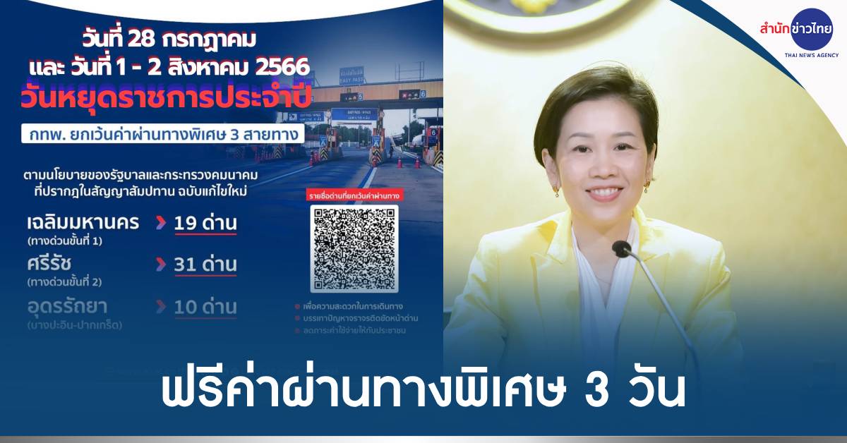 นางสาวรัชดา ธนาดิเรก รองโฆษกประจำสำนักนายกรัฐมนตรี เผยว่า ในช่วงวันหยุดยาวปลายเดือนกรกฎาคมต่อเนื่องถึงต้นเดือนสิงหาคม 2566 นี้ คาดว่าจะมีประชาชนออกเดินทางท่องเที่ยวและเดินทางกลับภูมิลำเนาทั่วประเทศเป็นจำนวนมาก การทางพิเศษแห่งประเทศไทย (กทพ.) กระทรวงคมนาคม ได้อำนวยความสะดวกในการเดินทางของประชาชนในวันหยุด โดยยกเว้นค่าผ่านทางพิเศษของทางพิเศษ จำนวน 3 สายทาง รวม 60 ด่าน ประกอบด้วย 1. ทางพิเศษเฉลิมมหานคร (ทางด่วนขั้นที่ 1) จำนวน 19 ด่าน 2. ทางพิเศษศรีรัช (ทางด่วนขั้นที่ 2) จำนวน 31 ด่าน และ 3. ทางพิเศษอุดรรัถยา (บางปะอิน-ปากเกร็ด) จำนวน 10 ด่าน ในวันศุกร์ที่ 28 กรกฎาคม 2566 (วันเฉลิมพระชนมพรรษาพระบาทสมเด็จพระเจ้าอยู่หัวรัชกาลที่ 10) วันอังคารที่ 1 สิงหาคม 2566 (วันอาสาฬหบูชา) และวันพุธที่ 2 สิงหาคม 2566 (วันเข้าพรรษา) รวม 3 วัน ซึ่งเป็นวันหยุดตามประกาศสำนักนายกรัฐมนตรี