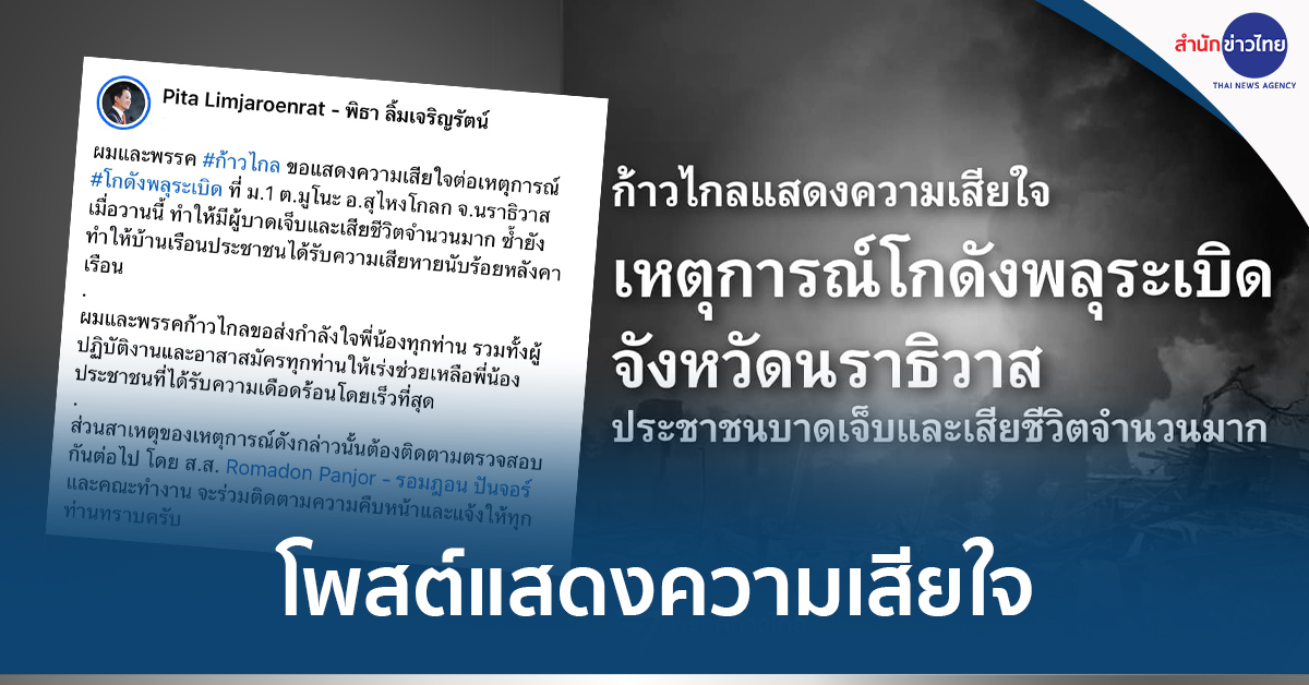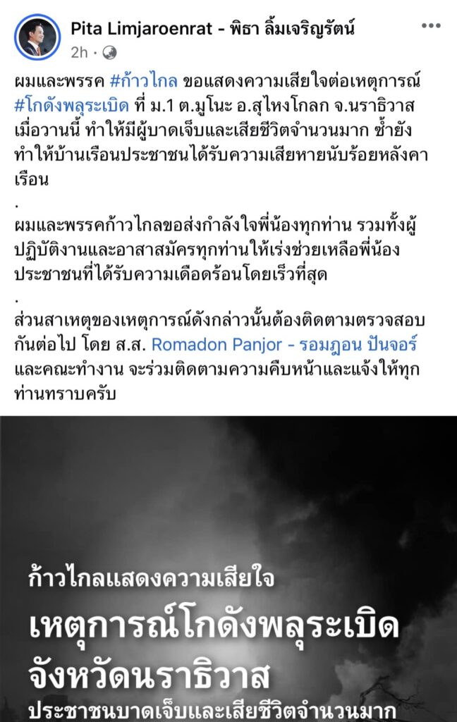 นายพิธา ลิ้มเจริญรัตน์ หัวหน้าพรรคก้าวไกลและแคนดิเดตนายกรัฐมนตรี โพสต์ข้อความผ่านเฟซบุ๊กถึงเหตุการณ์โกดังพลุระเบิด จังหวัดนราธิวาส ข้อความว่า ผมและพรรค #ก้าวไกล ขอแสดงความเสียใจต่อเหตุการณ์ #โกดังพลุระเบิด ที่ ม.1 ต.มูโนะ อ.สุไหงโกลก จ.นราธิวาส เมื่อวานนี้ ทำให้มีผู้บาดเจ็บและเสียชีวิตจำนวนมาก ซ้ำยังทำให้บ้านเรือนประชาชนได้รับความเสียหายนับร้อยหลังคาเรือน
