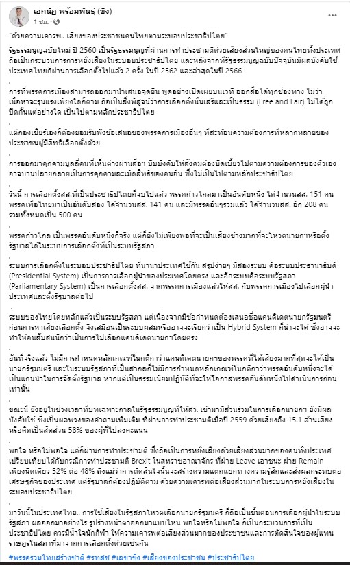 นายเอกนัฏ พร้อมพันธุ์ เลขาธิการพรรครวมไทยสร้างชาติ (รทสช.) โพสต์เฟซบุ๊กว่า “ด้วยความเคารพ.. เสียงของประชาชนคนไทยตามระบอบประชาธิปไตย”
