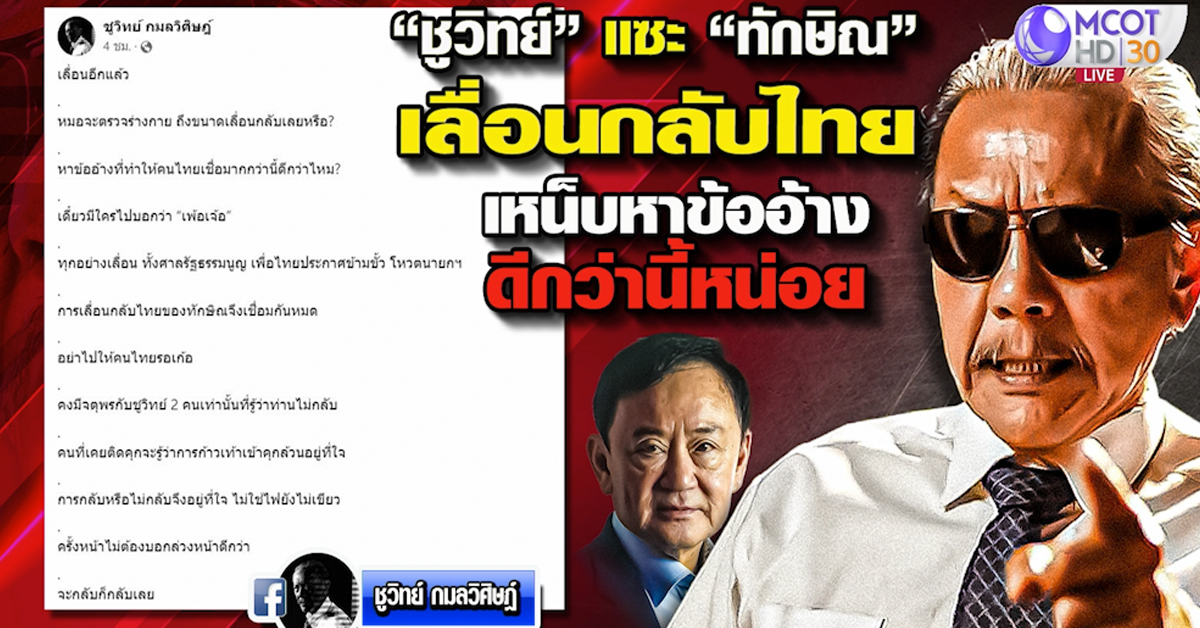 5 ส.ค.-โรคเลื่อนของการเมืองไทยยังระบาดไม่หยุด ล่าสุด “ทักษิณ” อดีตนายกรัฐมนตรี ประกาศเลื่อนกลับไทยแล้ว ขณะที่มีความเห็นจากหลายฝ่ายเกี่ยวกับการเลื่อนครั้งนี้ โดยเฉพาะ “ชูวิทย์”