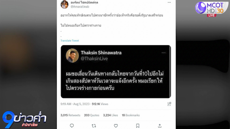 เมื่อช่วงเช้าวันนี้ นายทักษิณ ชินวัตร อดีตนายกรัฐมนตรี โพสต์ข้อความในทวิตเตอร์ @ThaksinLive ว่า “ผมขอเลื่อนวันเดินทางกลับไทย จากวันที่ 10 ไปอีกไม่เกินสองสัปดาห์ วันเวลาจะแจ้งอีกครั้ง หมอเรียกให้ไปตรวจร่างกายก่อนครับ”