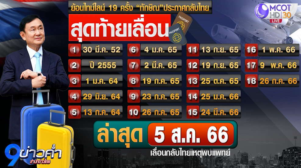 ทั้งนี้ ต้องมาติดตามกันว่าในอีกไม่เกิน 2 สัปดาห์ข้างหน้า หากนับจากกำหนดการเดิมในวันที่ 10 สิงหาคม ก็คือวันที่ 24 สิงหาคม นายทักษิณจะเดินทางกลับประเทศไทยหรือไม่ โดยตลอดระยะเวลา 15 ปี ที่ผ่านมา รวมล่าสุดครั้งนี้ นายทักษิณประกาศกลับบ้านมาแล้วรวมประมาณ 19 ครั้ง ขณะที่ก่อนหน้านี้มีรายงานข่าวว่า หนึ่งในสิ่งที่นายทักษิณหวังจะทำในการเดินทางกลับไทย แม้จะไม่มีคำยืนยันอย่างเป็นทางการก็คือ เพื่อร่วมงานฌาปนกิจศพนายวิชัย ช่างเหล็ก หรือลุงป๊อก อดีตคนขับรถคู่ใจ ซึ่งมีสวดพระอภิธรรมไปเมื่อวันที่ 21-24 กรกฎาคมที่ผ่านมา และครอบครัวของนายวิชัย ก็ทำพิธีบรรจุเก็บศพไว้ก่อนเป็นเวลา 30 วัน ต้องติดตามกันว่านายทักษิณ จะกลับมาทันหรือไม่.-สำนักข่าวไทย