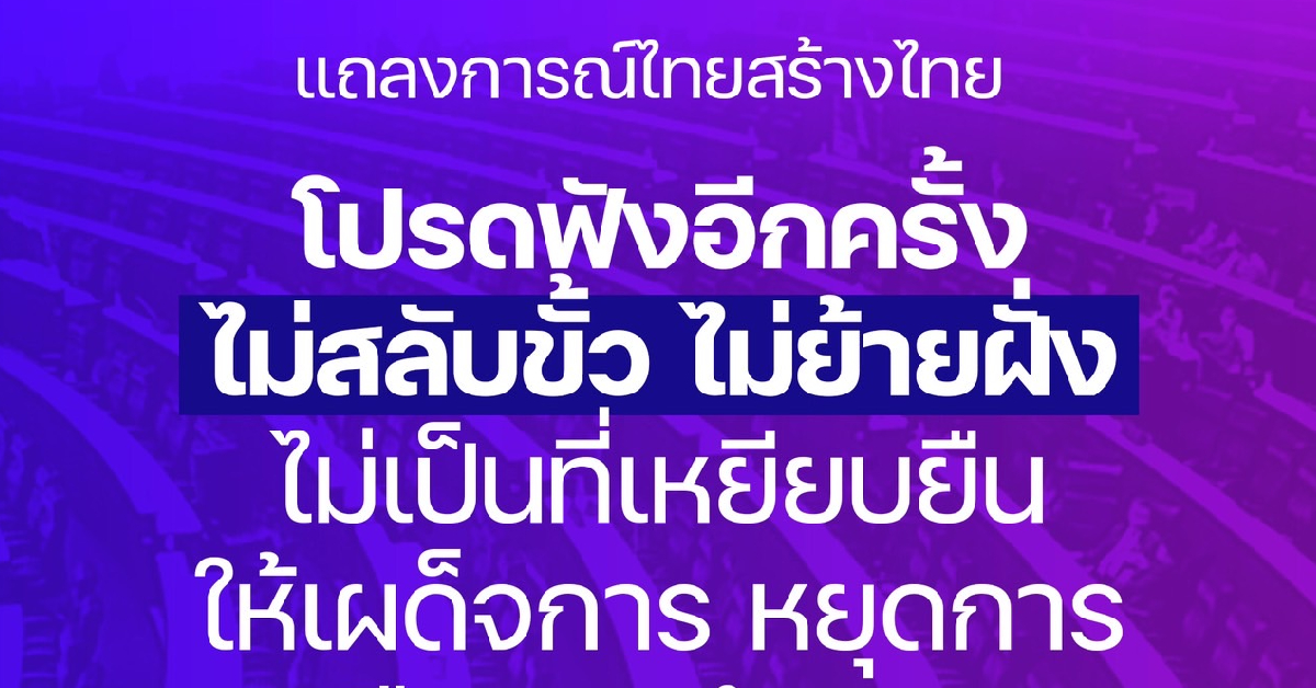 โดยเรายืนยันว่าจะยึดมั่นในสิ่งที่สัญญาเป็นสัจจะที่ให้ไว้กับประชาชน ทั้งการไม่เป็นนั่งร้านให้เผด็จการ และผลักดันรัฐธรรมนูญฉบับประชาชน รวมทั้งเร่งแก้ปัญหาปากท้องของประชาชนให้เป็นรูปธรรม