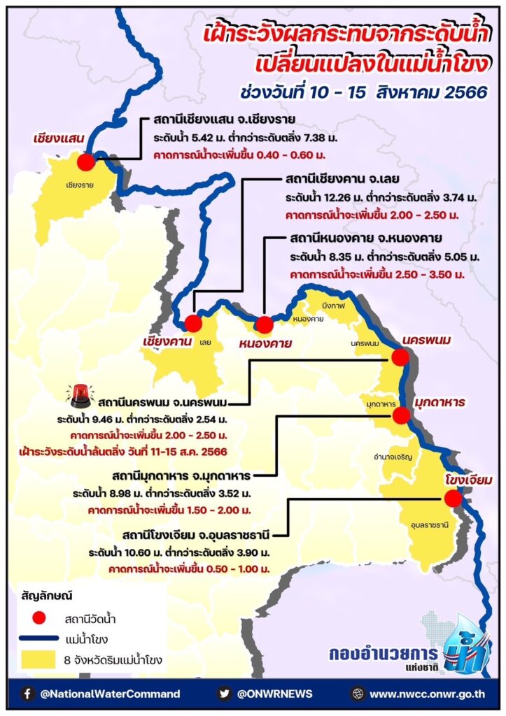 - สถานีนครพนม จังหวัดนครพนม ปัจจุบันมีระดับน้ำ 9.46 เมตร ต่ำกว่าระดับตลิ่ง 2.54 เมตรคาดการณ์ระดับน้ำจะเพิ่มขึ้น 2.5- – 3.5- เมตร และคาดการณ์ระดับน้ำจะมีแนวโน้มล้นตลิ่ง ในช่วงวันที่ 11 – 15 สิงหาคม 2566
