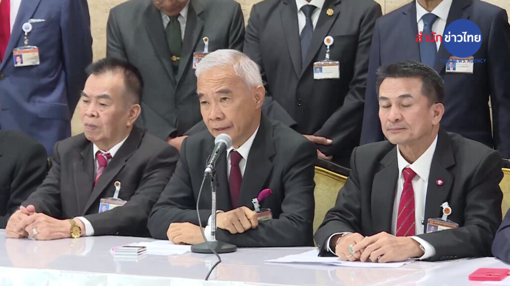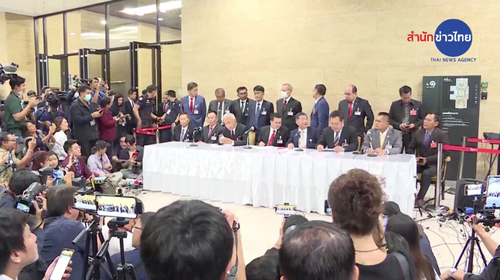 นพ.ชลน่าน ศรีแก้ว หัวหน้าพรรคเพื่อไทย พร้อมด้วยนายภูมิธรรม เวชยชัย รองหัวหน้าพรรคเพื่อไทย แถลงข่าวร่วมจัดตั้งรัฐบาล ประกอบ ด้วย พ.ต.อ.ทวี สอดส่อง สส.พรรคประชาชาติ, นายสุวัฒน์ ลิปตพัลลภ ประธานพรรคชาติพัฒนากล้า, พลตำรวจเอกเสรีพิศุทธ์ เตมียเวส หัวหน้าพรรคเสรีรวมไทย, นายเชาวฤทธิ์ ขจรพงศ์กีรติ พรรคพลังสังคมใหม่, นายบัญชา เดชเจริญศิริกุล พรรคท้องที่ไทย และนายวรเชษฐ เชิดชู เลขาธิการพรรคเพื่อไทยรวมพลัง