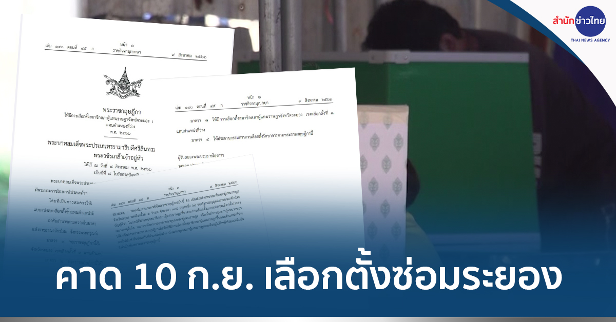 กทม. 9 ส.ค.- พ.ร.ฎ.เลือกตั้งซ่อม ส.ส.เขต 3 ระยอง มีผลใช้บังคับแล้ว กกต.เตรียมประชุมสัปดาห์นี้กำหนดวันเลือกตั้ง-วันสมัคร คาดเลือกตั้ง 10 ก.ย.