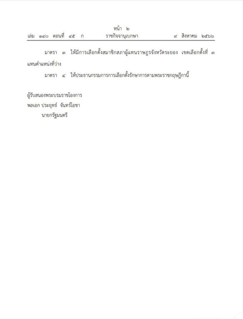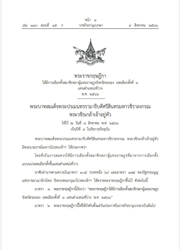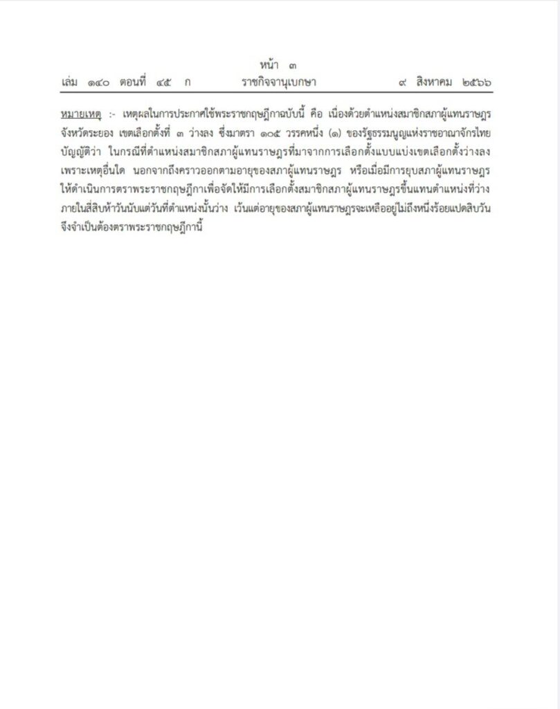 เว็บไซต์ราชกิจจานุเบกษาได้เผยแพร่ ประกาศพระราชกฤษฎีกาให้มีการเลือกตั้งส.ส.จังหวัดระยอง เขตเลือกตั้งที่ 3 แทนตำแหน่งที่ว่าง พ.ศ.2566 แล้ว โดยให้พระราชกฤษฎีกานี้ใช้บังคับตั้งแต่วันประกาศในราชกิจจานุเบกษาเป็นต้นไป และให้ประธานกรรมการการเลือกตั้งรักษาการตามพระราชกฤษฎีกานี้