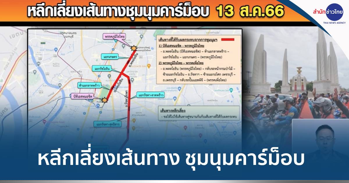 กทม. 13 ส.ค.-บช.น. ประชาสัมพันธ์วางแผนการเดินทาง หลีกเลี่ยงเส้นทางตั้งแต่เวลา 13.00 น. โดยมีการนัดรวมตัวผู้ชุมนุมฯ คาร์ม็อบ ตั้งขบวนบริเวณบีทีเอสหมอชิต เคลื่อนตัวไปยังที่ทำการพรรคภูมิใจไทย ถ.พหลโยธิน และพรรคเพื่อไทย ถ.เพชรบุรี