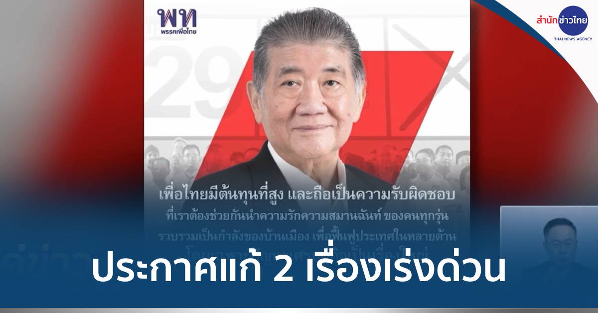 กทม. 13 ส.ค.-พรรคเพื่อไทย ฐานะแกนนำในการจัดตั้งรัฐบาล โพสต์ข้อความมุ่งมั่นแก้วิกฤตเศรษฐกิจของพี่น้องประชาชน ในการพักหนี้เกษตรกรและพักชำระหนี้ SME พร้อมปรับลดราคาพลังงาน น้ำมัน ไฟฟ้าและก๊าช