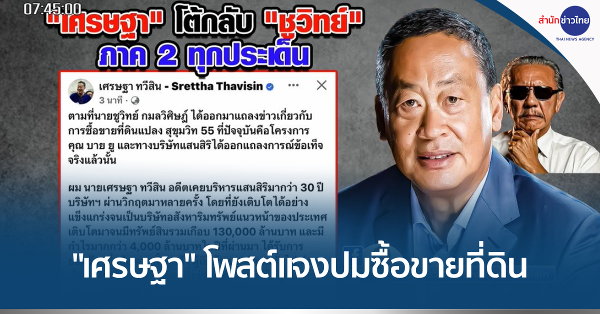 กรุงเทพฯ 16 ส.ค. – “เศรษฐา” แจงแล้วปม “ชูวิทย์” แฉใช้บริษัทนอมินี แม่บ้าน รปภ. ถือหุ้น ซื้อที่ดินแปลงสุขุมวิท 55 ลั่นการกระทำใดๆ ที่บิดเบือน ไม่เป็นความจริง ฝ่ายกฎหมายจะรวบรวมข้อมูลเพื่อพิสูจน์ข้อเท็จจริง และต่อสู้ตามกระบวนการยุติธรรมจนถึงที่สุด