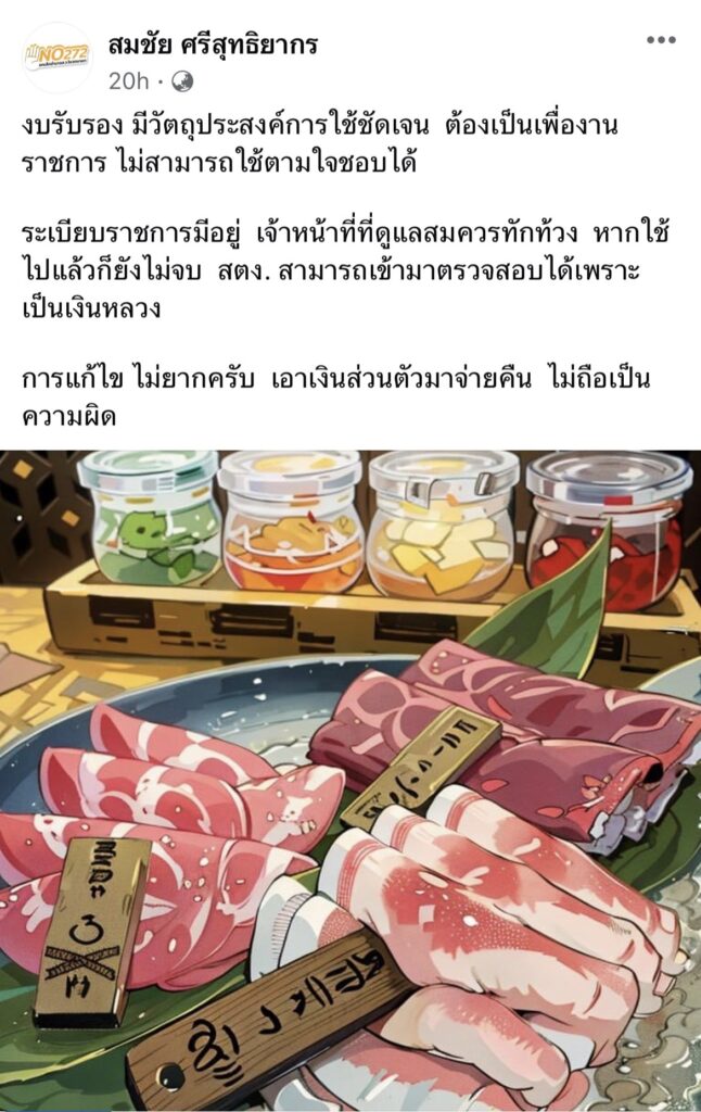 กทม. 20 ส.ค.- “สมชัย” โพสต์ แนะ “หมออ๋อง” นำเงินส่วนตัวมาคืนงบฯ เลี้ยงหมูกะทะแม่บ้านสภาฯ ระบุ เป็นเงินหลวง ต้องใช้เพื่องานราชการ ไม่สามารถใช้ตามใจชอบได้