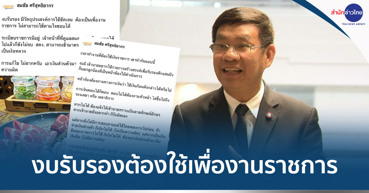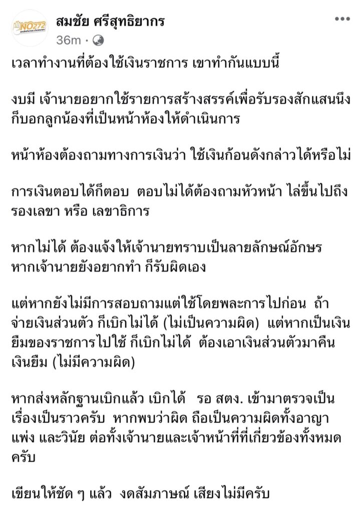 นายสมชัย โพสต์ข้อความอีกว่า เวลาทำงานที่ต้องใช้เงินราชการ เขาทำกันแบบนี้ งบมี เจ้านายอยากใช้รายการสร้างสรรค์เพื่อรับรองสักแสนนึง ก็บอกลูกน้องที่เป็นหน้าห้องให้ดำเนินการ หน้าห้องต้องถามทางการเงินว่า ใช้เงินก้อนดังกล่าวได้หรือไม่ การเงินตอบได้ก็ตอบ ตอบไม่ได้ต้องถามหัวหน้า ไล่ขึ้นไปถึงรองเลขา หรือ เลขาธิการ หากไม่ได้ ต้องแจ้งให้เจ้านายทราบเป็นลายลักษณ์อักษร หากเจ้านายยังอยากทำ ก็รับผิดเอง แต่หากยังไม่มีการสอบถามแต่ใช้โดยพละการไปก่อน ถ้าจ่ายเงินส่วนตัว ก็เบิกไม่ได้ (ไม่เป็นความผิด) แต่หากเป็นเงินยืมของราชการไปใช้ ก็เบิกไม่ได้ ต้องเอาเงินส่วนตัวมาคืนเงินยืม (ไม่มีความผิด)