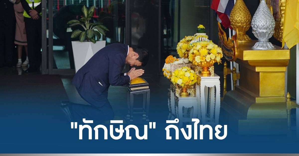 ดอนเมือง 22 ส.ค.-“ทักษิณ” อดีตนายกฯ ถึงไทยแล้ว ก้มกราบพระบรมฉายาลักษณ์ พร้อมทักทายนักการเมืองและมวลชนที่มารอรับ