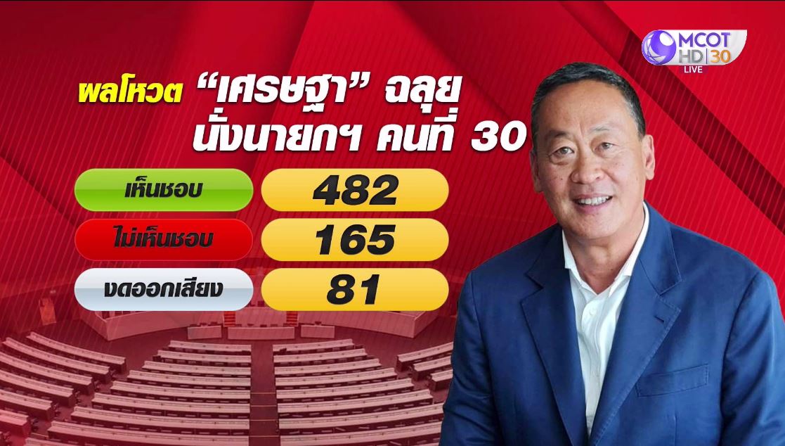 รัฐสภา 22 ส.ค. – มติรัฐสภา โหวต “เศรษฐา” เป็นนายกฯ คนที่ 30 เห็นชอบ 482 เสียง ไม่เห็นชอบ 165 เสียง งดออกเสียง 81 เสียง