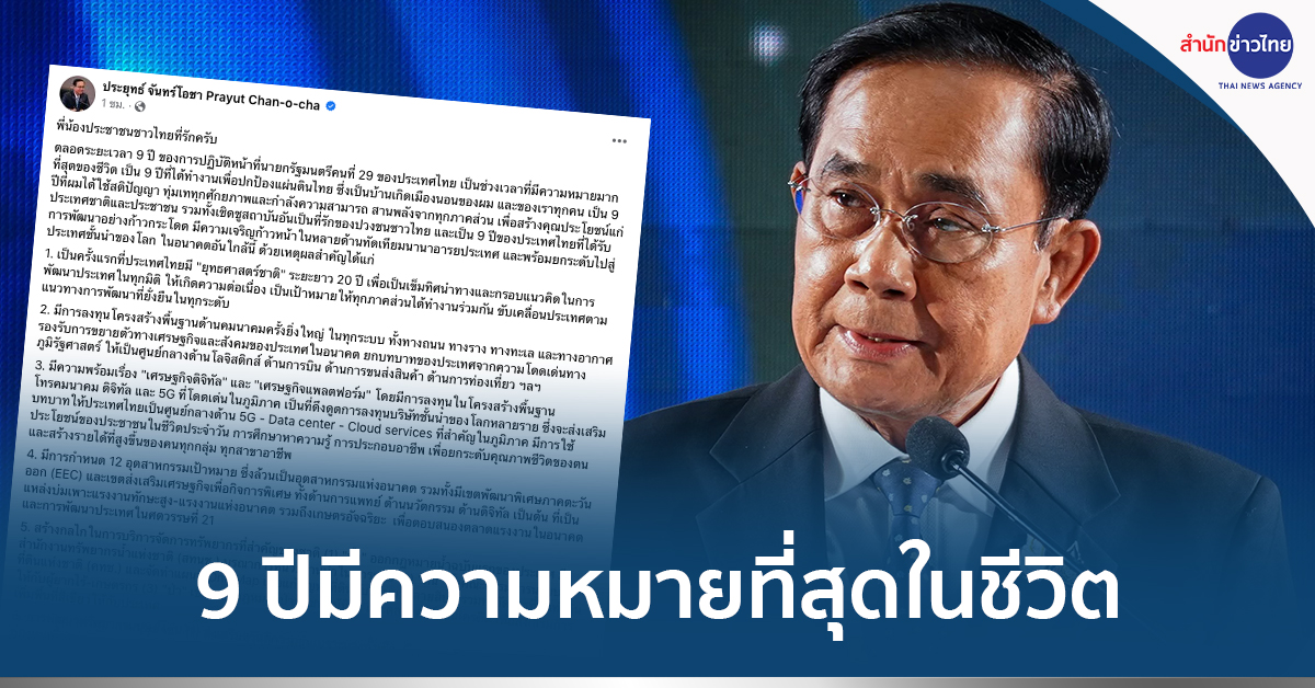 พล.อ.ประยุทธ์ จันทร์โอชา นายกรัฐมนตรี โพสต์เฟซบุ๊กระบุตลอดระยะเวลา 9 ปี ของการปฏิบัติหน้าที่นายกรัฐมนตรีคนที่ 29 ของประเทศไทย เป็นช่วงเวลาที่มีความหมายมากที่สุดของชีวิต เป็น 9 ปีที่ได้ทำงานเพื่อปกป้องแผ่นดินไทย ซึ่งเป็นบ้านเกิดเมืองนอนของตนและของเราทุกคน เป็น 9 ปีที่ได้ใช้สติปัญญา ทุ่มเททุกศักยภาพและกำลังความสามารถ สานพลังจากทุกภาคส่วน เพื่อสร้างคุณประโยชน์แก่ประเทศชาติและประชาชน รวมทั้งเชิดชูสถาบันอันเป็นที่รักของปวงชนชาวไทย และเป็น 9 ปีของประเทศไทยที่ได้รับการพัฒนาอย่างก้าวกระโดด มีความเจริญก้าวหน้าในหลายด้านทัดเทียมนานาอารยประเทศ และพร้อมยกระดับไปสู่ประเทศชั้นนำของโลก ในอนาคตอันใกล้นี้ ด้วยเหตุผลสำคัญได้แก่