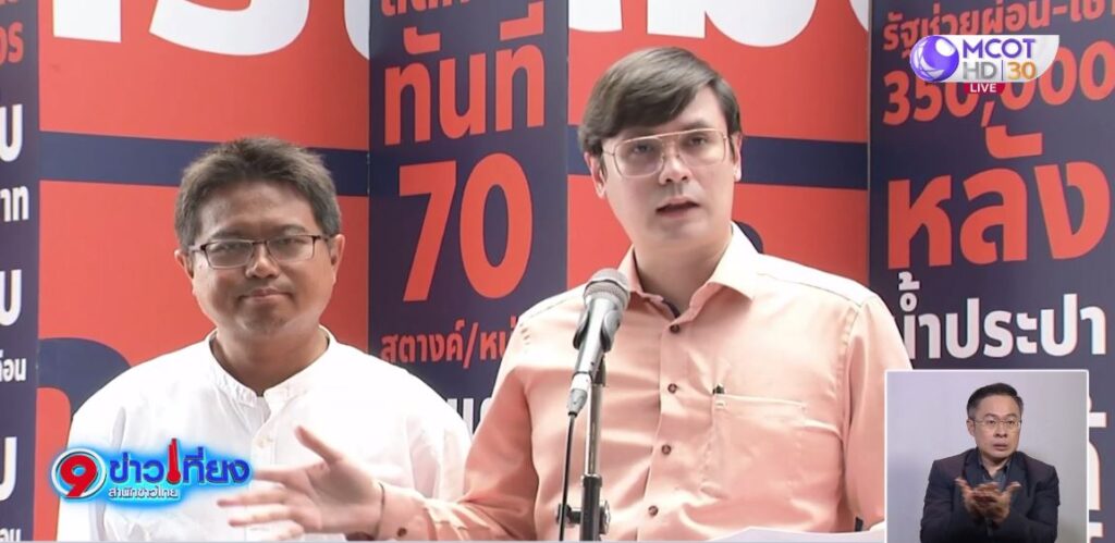 นายรังสิมันต์ โรม โฆษกพรรคก้าวไกล และนายโย พงศธร ศรเพชรนรินทร์ ผู้สมัครเลือกตั้งซ่อม สส. พรรคก้าวไกล ระยอง เขต 3 ร่วมแถลงกรณีข้อกล่าวหาทางด้านภาษีและคดียักยอกทรัพย์ ตามที่ปรากฏในข่าว