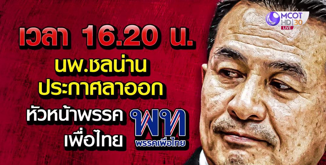 พรรคเพื่อไทย 30 ส.ค. – “หมอชลน่าน” แถลงลาออก หน.เพื่อไทย ตามสัญญาที่ให้ไว้กับประชาชนหากจับมือพรรคลุง ชี้ภารกิจนั้นสำเร็จแล้ว จึงขอประกาศลาออก และที่ประชุม คกก.บริหารพรรคมีมติเลือก “ชูศักดิ์” เป็น รก.หัวหน้าพรรค