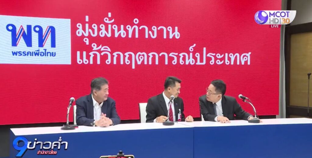 วันนี้ นพ.ชลน่าน ศรีแก้ว หัวหน้าพรรคเพื่อไทย พร้อมนายภูมิธรรม เวชยชัย รองหัวหน้าพรรค นายประเสริฐ จันทรรวงทอง เลขาธิการพรรคฯ ร่วมกันแถลงข่าวหลังประชุม กก.บห.พรรค (14.00-16.00 น.)