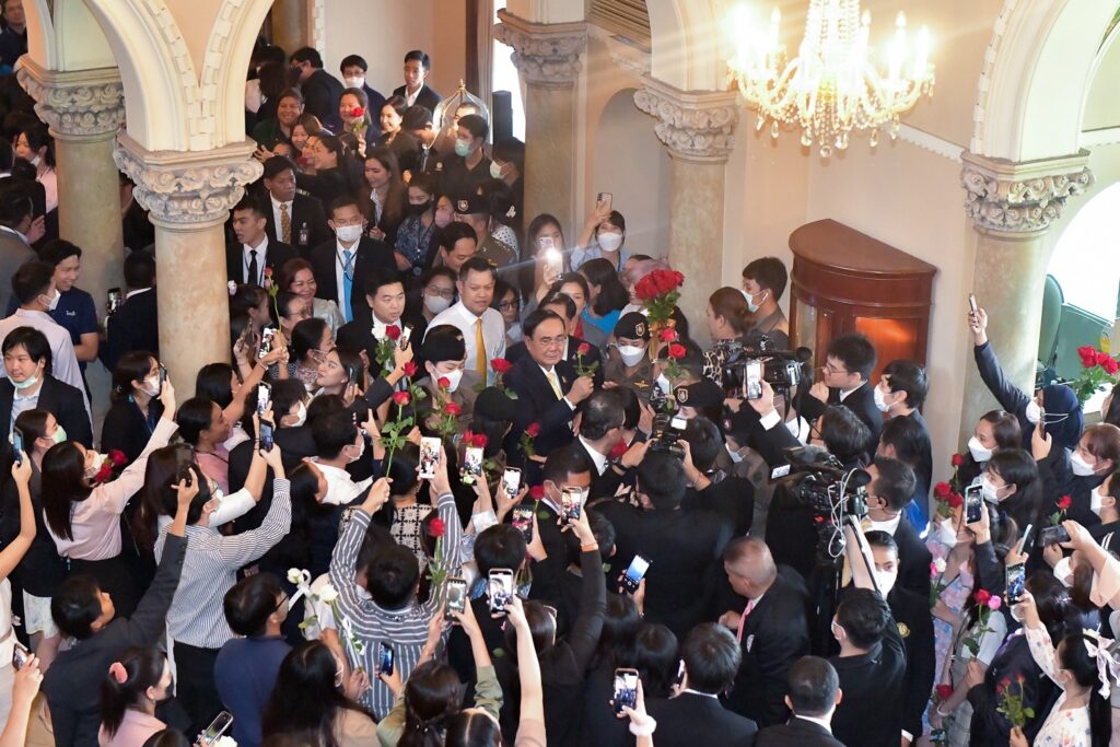 หลังจาก พล.อ.ประยุทธ์ ได้พบปะกับข้าราชการที่ร่วมอำลา และเดินออกจากตึกไทยคู่ฟ้า เพื่อไปทักทายกับบรรดาแฟนคลับที่มารอบริเวณข้างสนามหญ้าข้างตึกไทยคู่ฟ้า ช่วงหนึ่ง พล.อ.ประยุทธ์ ได้หันกลับมามอง กวาดสายตามองรอบตึกไทยคู่ฟ้า พร้อมกับยกมือไหว้ และเดินไปทักทายกับประชาชน