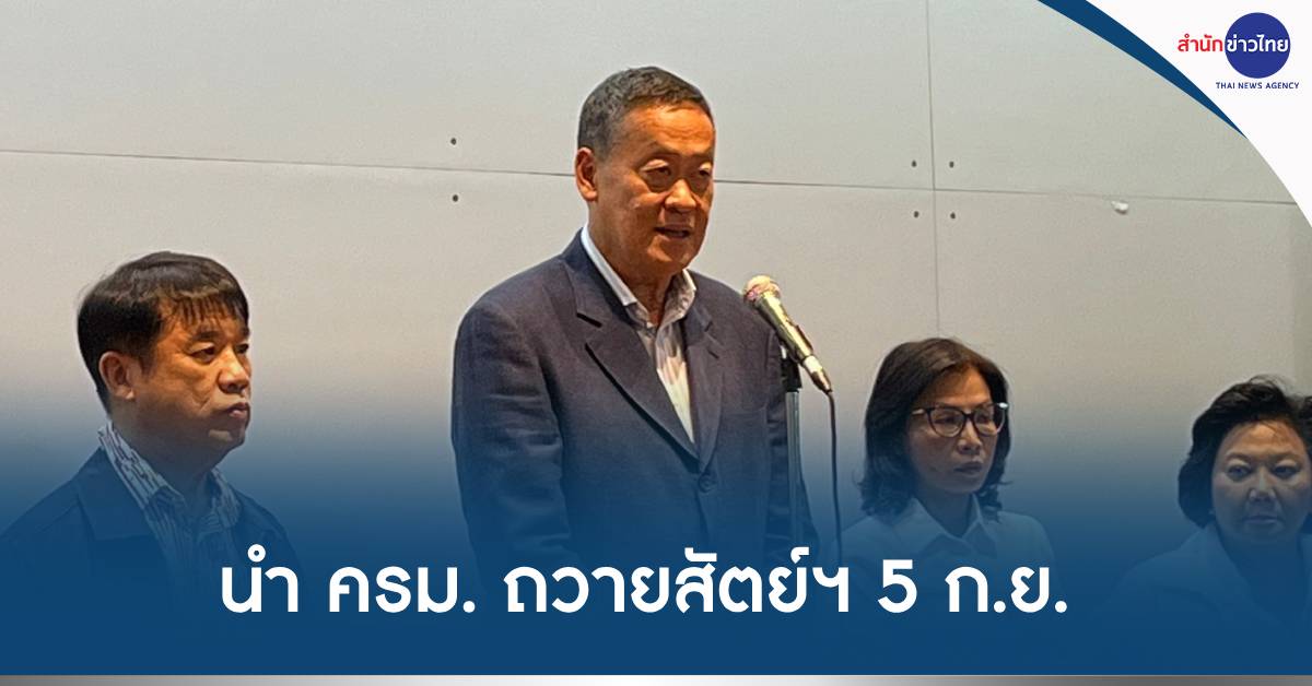 พรรคเพื่อไทย 2 ก.ย.-“เศรษฐา” เผยเตรียมนำ ครม. ถวายสัตย์ฯ 5 ก.ย. พร้อม ถก ครม.นัดพิเศษ 6 ก.ย. ก่อนแถลงนโยบายต่อสภาฯ ยันโควตา “ไผ่ ลิกค์-พิชิต” ยังอยู่ แต่มีความไม่ชัดเจนเรื่องคุณสมบัติ จึงขอถอนไปตรวจสอบให้แน่นอนก่อน เผยเตรียมบินประชุมยูเอ็น ที่นิวยอร์ก 18 ก.ย.นี้