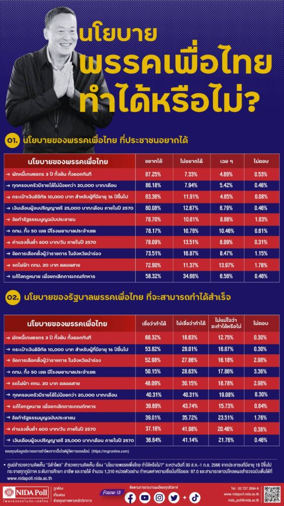 ศูนย์สำรวจความคิดเห็น “นิด้าโพล” สถาบันบัณฑิตพัฒนบริหารศาสตร์ (นิด้า) เปิดเผยผลสำรวจของประชาชน เรื่อง “นโยบายพรรคเพื่อไทย ทำได้หรือไม่?”โดยสำรวจระหว่างวันที่ 30 สิงหาคม ถึง วันที่ 1 กันยายน 2566 จากประชาชนที่มีอายุ 18 ปีขึ้นไป กระจายทุกภูมิภาค ระดับการศึกษา อาชีพ และรายได้ ทั่วประเทศ รวมทั้งสิ้น จำนวน 1,310 หน่วยตัวอย่าง เกี่ยวกับนโยบายของพรรคเพื่อไทย