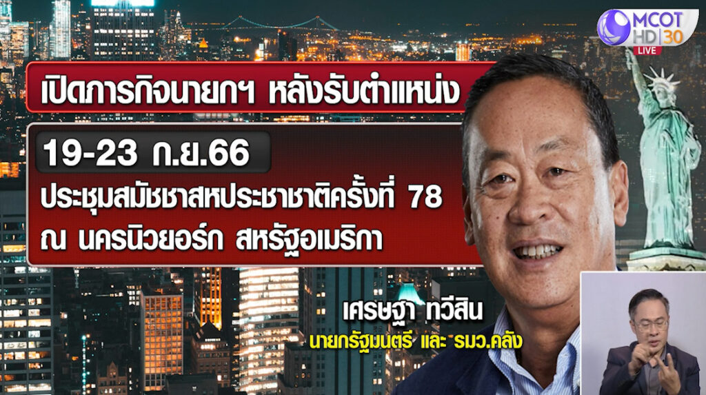 ส่วนภารกิจการประชุมสมัชชาสหประชาชาติครั้งที่ 78 ณ นครนิวยอร์ก สหรัฐอเมริกา 19-23 กันยายน นายเศรษฐา ยืนยันว่า ตนจะเดินทางไป โดยจะออกเดินทางในคืนวันที่ 18 ก.ย.และเริ่มภารกิจทันทีในวันที่ 19 ก.ย. โดยจะมีรัฐมนตรีที่เกี่ยวข้องหลายคนร่วมเดินทางไปด้วย โดยเฉพาะ นายปานปรีย์ พหิทธานุกร รองนายกรัฐมนตรีและรัฐมนตรีว่าการกระทรวงการต่างประเทศ