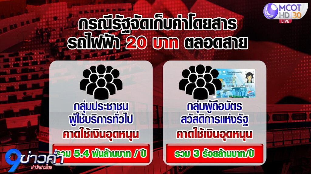 ทั้งนี้ กรณี ค่าโดยสารรถไฟฟ้า 20 บาทตลอดสาย มีการศึกษาตามกลุ่มเป้าหมายผู้เดินทางด้วยระบบขนส่งมวลชนทางราง ใน 2 กรณี คือ 1. กลุ่มประชาชนผู้ใช้บริการทั่วไป และ 2. กลุ่มผู้ถือบัตรสวัสดิการแห่งรัฐ ซึ่งจากการศึกษาพบว่า ในกลุ่มประชาชนผู้ใช้บริการทั่วไป หากรัฐจัดเก็บค่าโดยสาร 20 บาทตลอดสาย คาดว่าจะต้องใช้เงินอุดหนุนจากภาครัฐรวม 5,446 ล้านบาท/ปี ส่วน กลุ่มผู้ถือบัตรสวัสดิการแห่งรัฐ คาดว่าจะต้องใช้เงินจากภาครัฐอุดหนุน รวม 307.86 ล้านบาท/ปี
