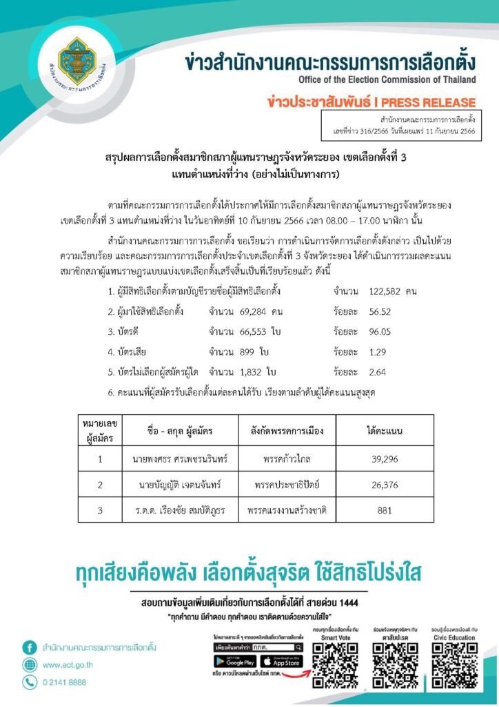 สำนักงานคณะกรรมการการเลือกตั้ง(กกต.) สรุปผลการเลือกตั้งสมาชิกสภาผู้แทนราษฎร เขตเลือกตั้งที่ 3 จังหวัดระยอง แทนตำแหน่งที่ว่างอย่างไม่เป็นทางการ หลังจากที่จัดให้เลือกตั้งเมื่อวานนี้(10 ก.ย.) ว่า การเลือกตั้งเป็นไปด้วยความเรียบร้อย และคณะกรรมการการเลือกตั้งประจำเขตเลือกตั้งที่ 3 จังหวัดระยองได้รวมผลคะแนนเลือกตั้งเสร็จเรียบร้อยแล้ว โดยพื้นที่มีผู้มีสิทธิเลือกตั้งตามบัญชีรายชื่อผู้มีสิทธิเลือกตั้ง 122,582 คน มีผู้มาใช้สิทธิ 69,284 คน คิดเป็นร้อยละ 56.52 พบว่าเป็นบัตรดี 66,553 ใบ คิดเป็นร้อยละ 96.05 บัตรเสีย 899 ใบ คิดเป็นร้อยละ 1.29 บัตรไม่เลือกผู้สมัคร 1,832 ใบ คิดเป็นร้อยละ 2.64