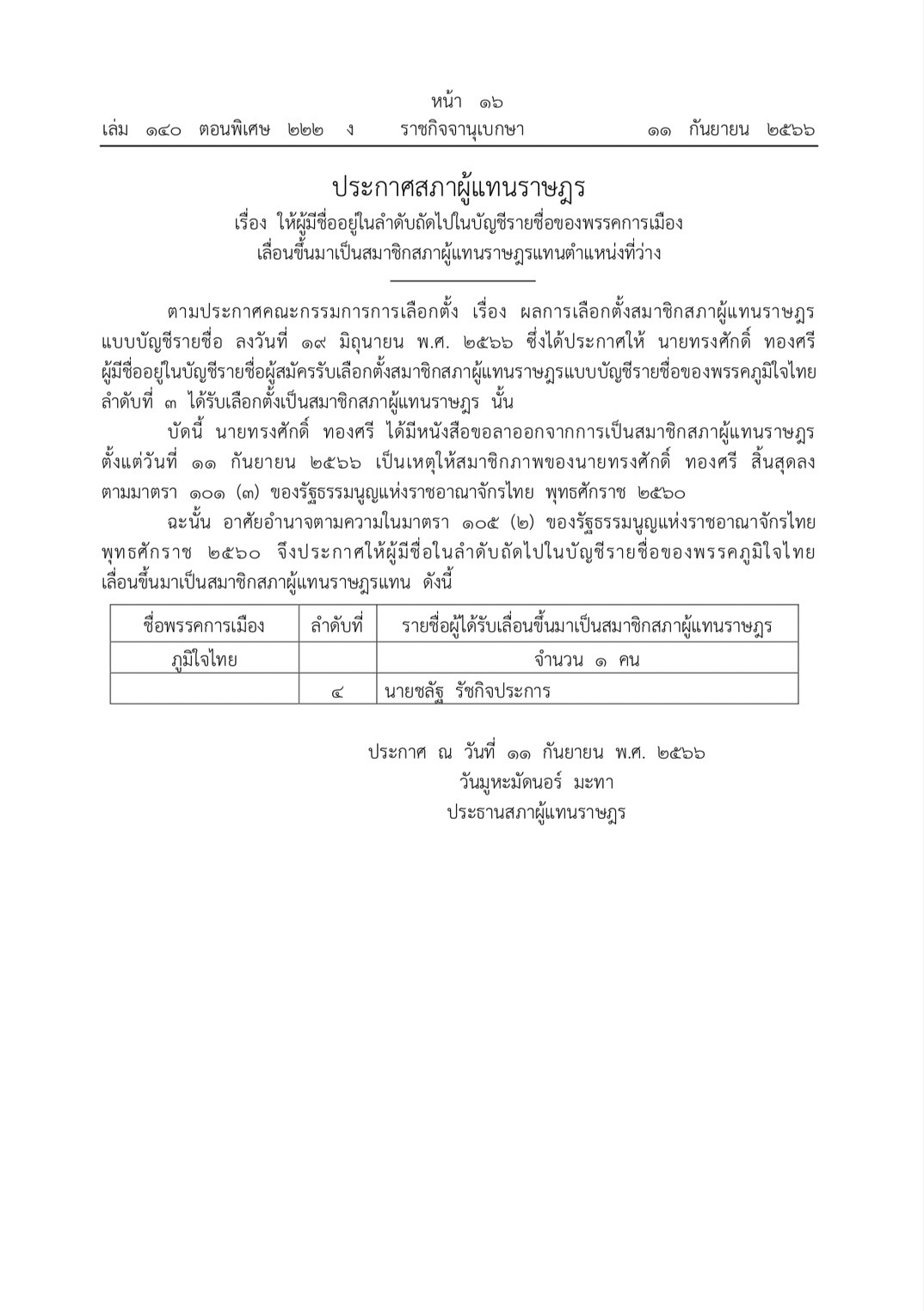 ผู้สื่อข่าวรายงานว่า ราชกิจจานุเบกษา เผยแพร่ประกาศสภาผู้แทนราษฎร เรื่อง ให้ผู้มีชื่ออยู่ในลำดับถัดไปในบัญชีรายชื่อของพรรคการเมืองเลื่อนขึ้นมาเป็นสมาชิกสภาผู้แทนราษฎรแทนตำแหน่งที่ว่าง