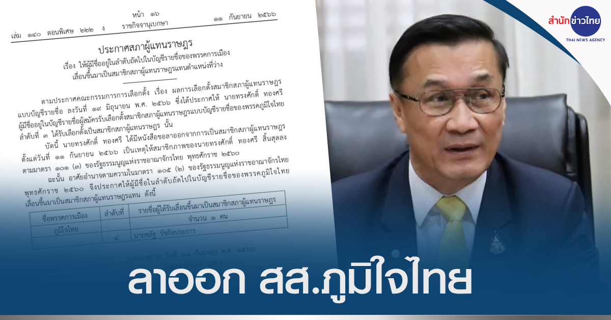 บัดนี้ นายทรงศักดิ์ ทองศรี ได้มีหนังสือขอลาออกจากการเป็นสมาชิกสภาผู้แทนราษฎร ตั้งแต่วันที่ 11 กันยายน 2566 เป็นเหตุให้สมาชิกภาพของนายทรงศักดิ์ ทองศรี สิ้นสุดลง ตามมาตรา 101 (3) ของรัฐธรรมนูญแห่งราชอาณาจักรไทย พุทธศักราช 2566