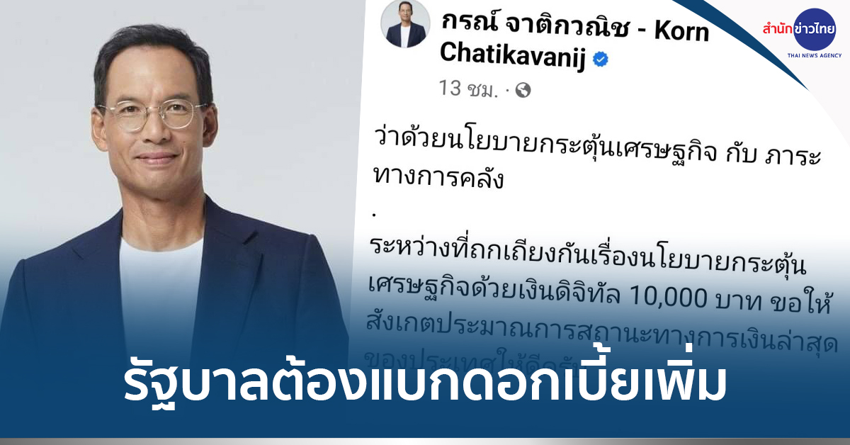 “วันนี้หนี้รัฐบาลมีอยู่ 11 ล้านล้านบาท รัฐบาลต้องออกพันธบัตรใหม่มาชำระชุดเก่าตลอดเวลา ซึ่งต้นทุนก็จะมีแต่สูงขึ้น เป็นภาระต่องบประมาณมากขึ้น แนวโน้มดอกเบี้ยเราจะสูงขึ้นเรื่อยๆ ด้วยหลากหลายปัจจัย เช่นการส่งออกที่ซบเซา ราคานํ้ามันโลกที่สูงขึ้น รวมไปถึงรายจ่ายภาครัฐจากนโยบาย ‘กระตุ้นเศรษฐกิจ’ ของรัฐบาลใหม่ จุดแข็งของไทยเราคือ เราแทบไม่มีหนี้สกุลเงินต่างประเทศ แต่อย่างไรเราก็เป็นส่วนหนึ่งของระบบเศรษฐกิจของโลก ไม่ระวังไม่ได้ครับ” นายกรณ์ระบุ .-สำนักข่าวไทย